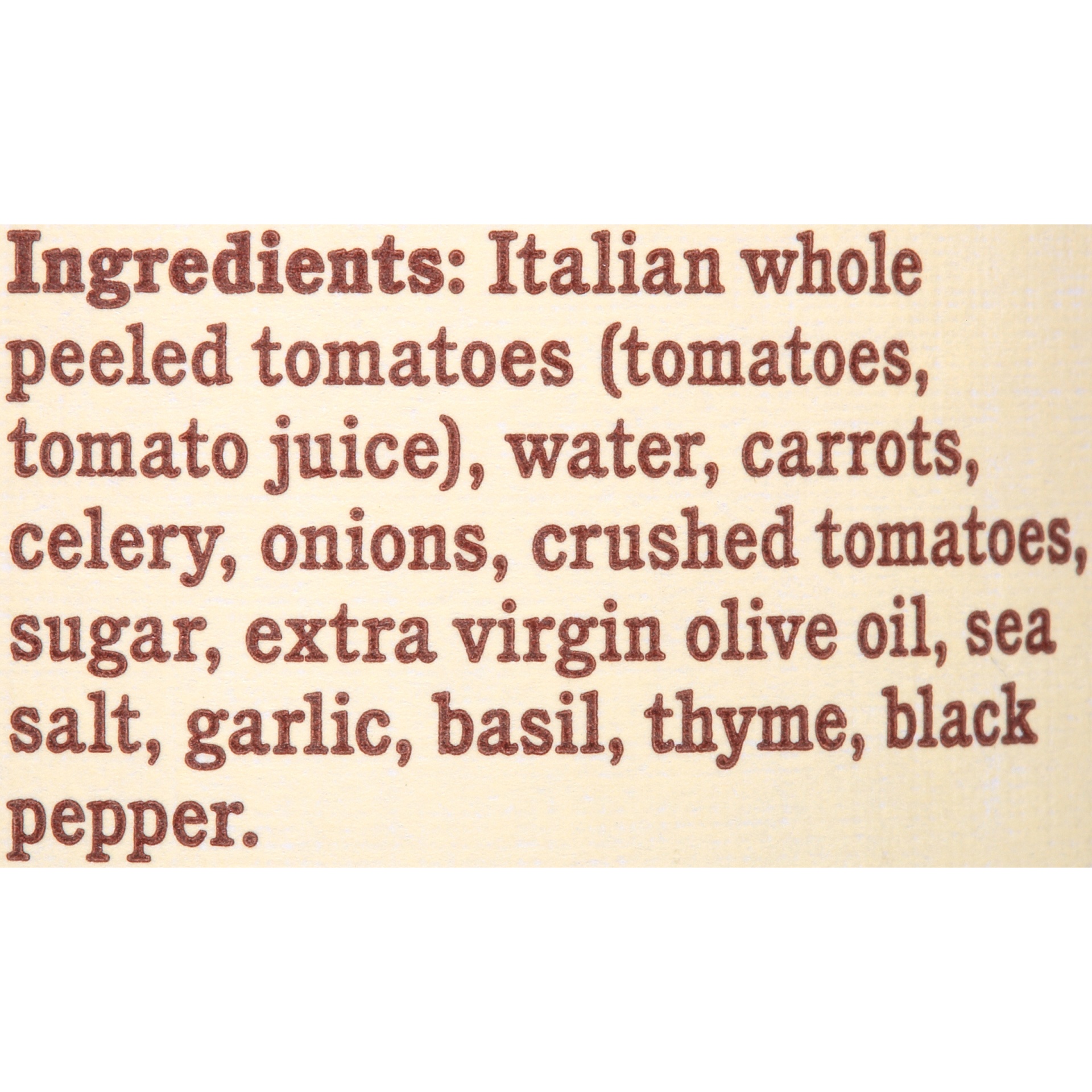 INGREDIENTS: ITALIAN TOMATOES, WATER, TOMATO PUREE, CELERY, CARROTS, ONIONS, CONTAINS 2% OR LESS OF: BASIL, SUGAR, OLIVE OIL, SALT, GARLIC, SPICES.