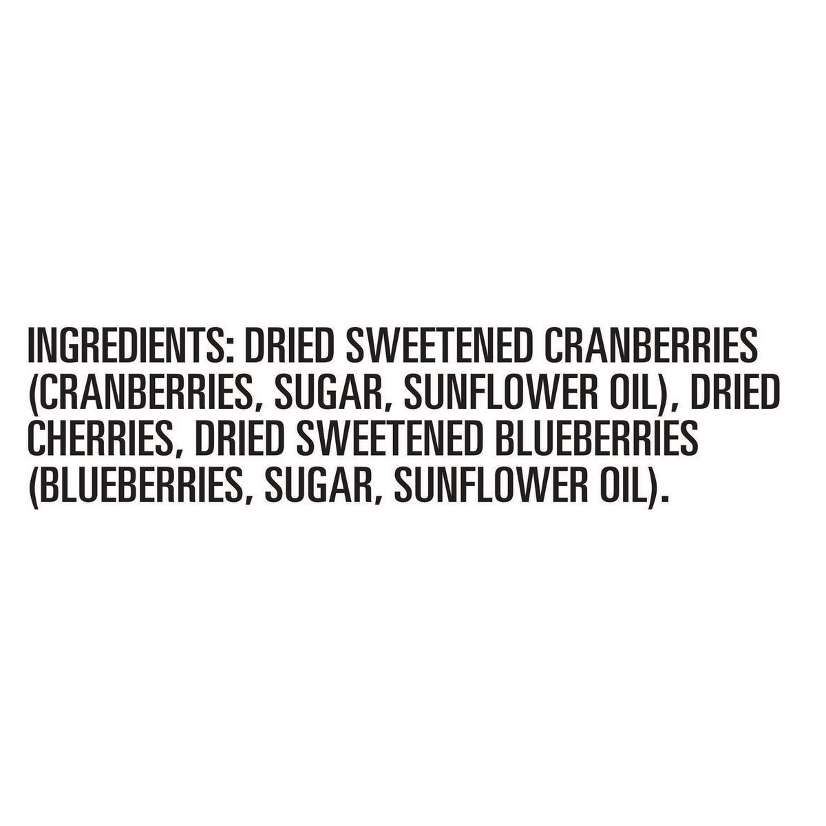 Ingredients: Dried Sweetened Cranberries (Cranberries, Sugar, Sunflower Oil), Dried Cherries, Dried Sweetened Blueberries (Blueberries, Sugar, Sunflower Oil).