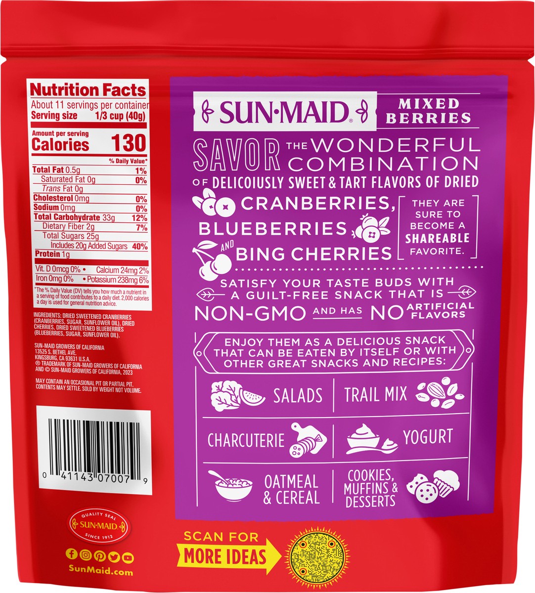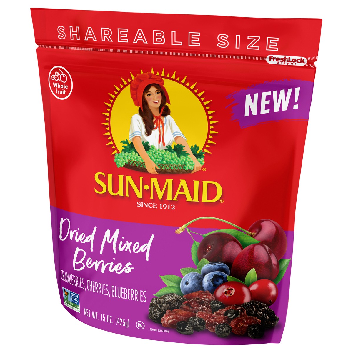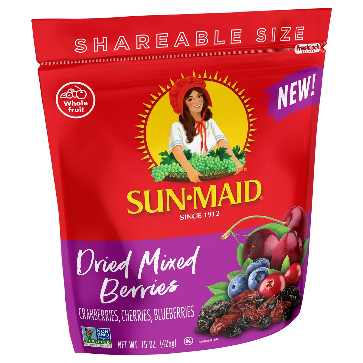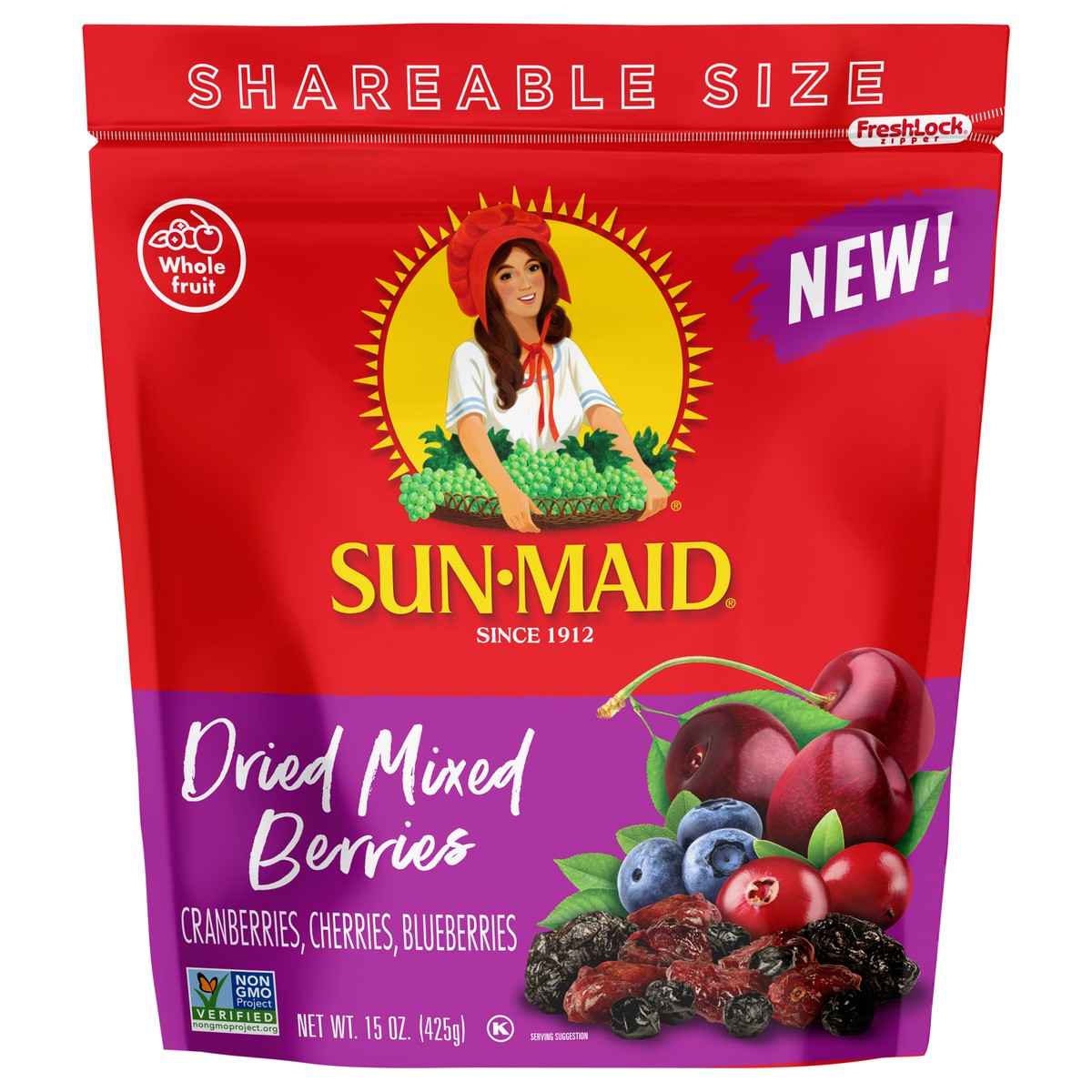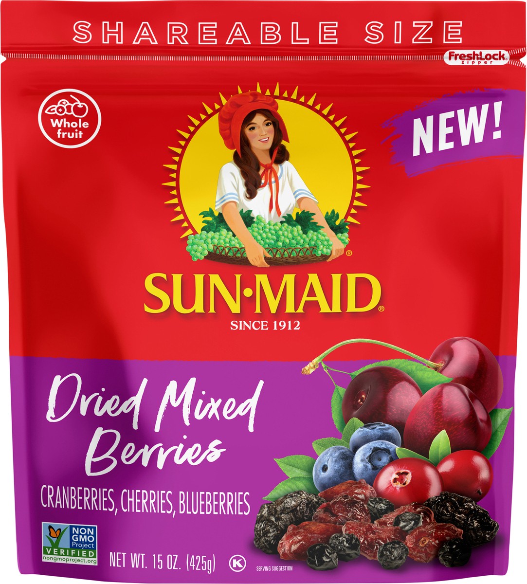 Sun-Maid Mixed Berries. Savor the wonderful combination of deliciously sweet & tart flavors of dried cranberries, blueberries, and Bing cherries. They are sure to become a sharable favorite. Satisfy y…