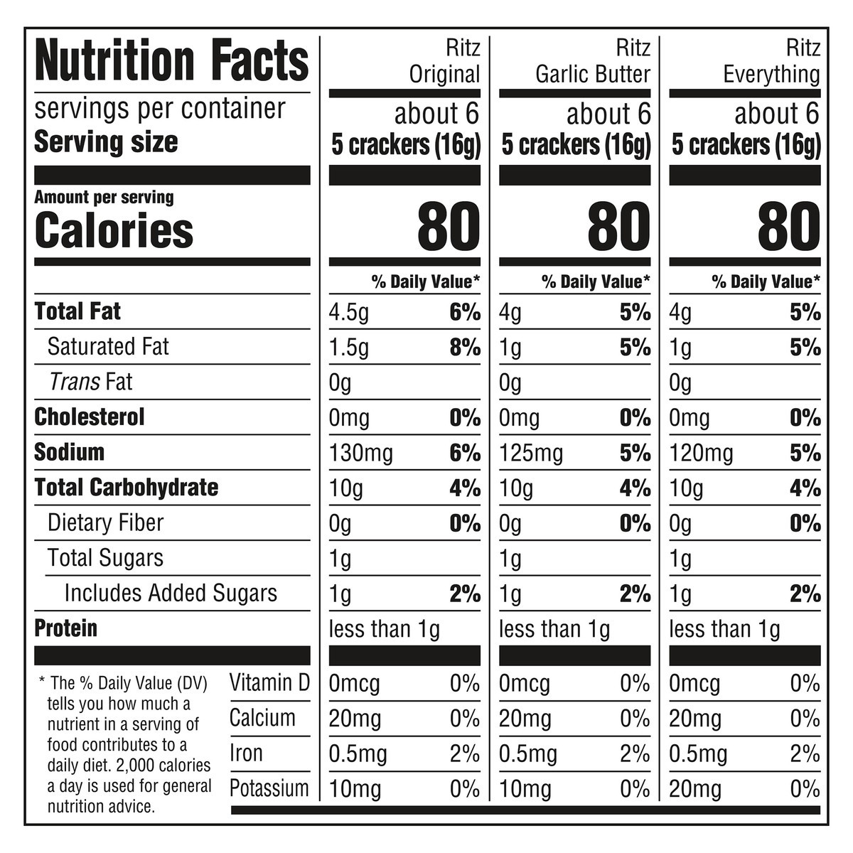 Ritz Original: Unbleached Enriched Flour (Wheat Flour, Niacin, Reduced Iron, Thiamine Mononitrate [Vitamin B1], Riboflavin [Vitamin B2], Folic Acid), Soybean and/or Canola Oil, Palm Oil, Sugar, Salt, …