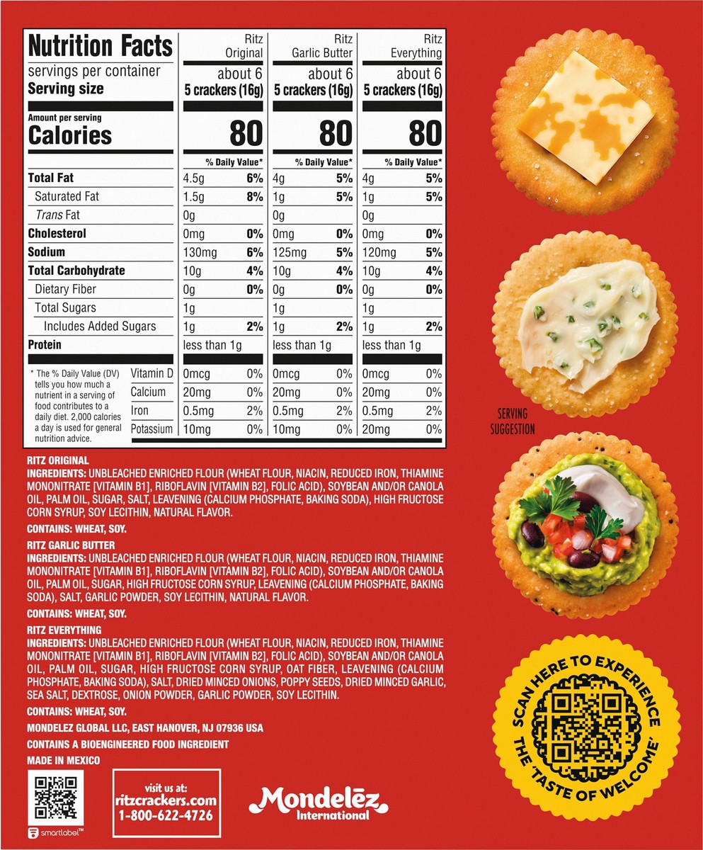 Ritz Original: Unbleached Enriched Flour (Wheat Flour, Niacin, Reduced Iron, Thiamine Mononitrate [Vitamin B1], Riboflavin [Vitamin B2], Folic Acid), Soybean and/or Canola Oil, Palm Oil, Sugar, Salt, …