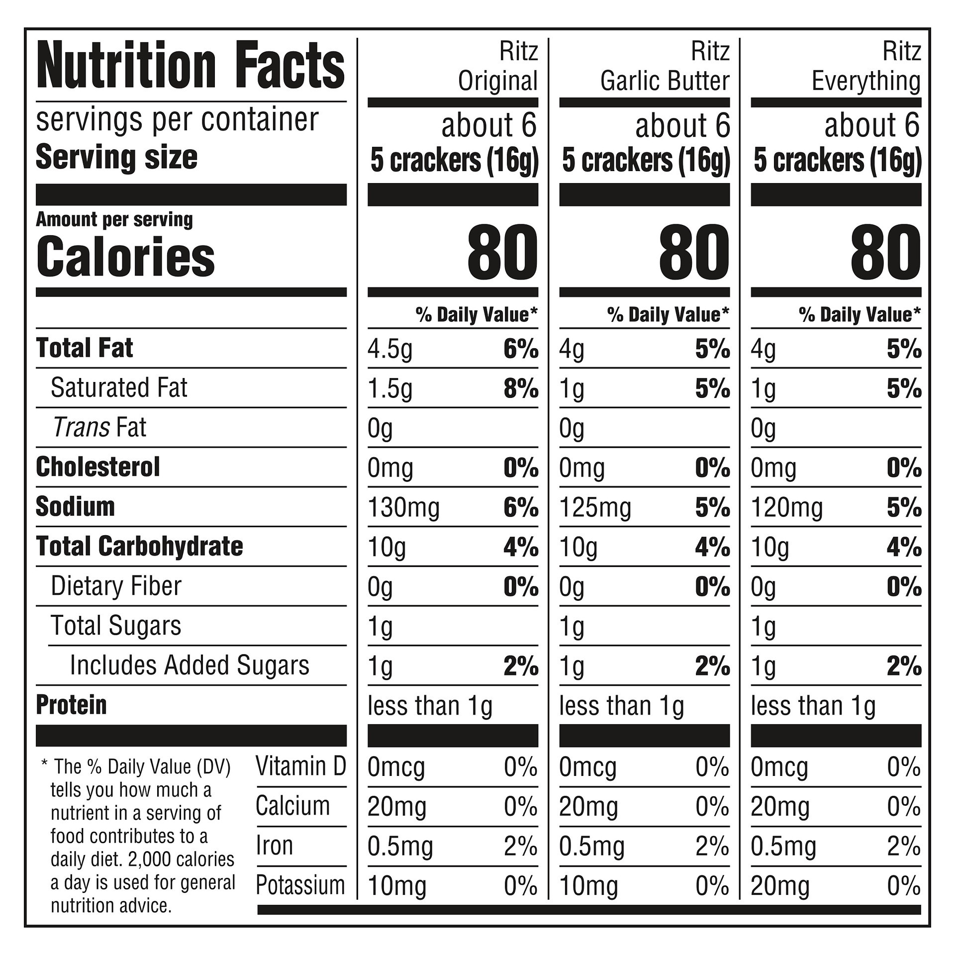 Ritz Original: Unbleached Enriched Flour (Wheat Flour, Niacin, Reduced Iron, Thiamine Mononitrate [Vitamin B1], Riboflavin [Vitamin B2], Folic Acid), Soybean and/or Canola Oil, Palm Oil, Sugar, Salt, …