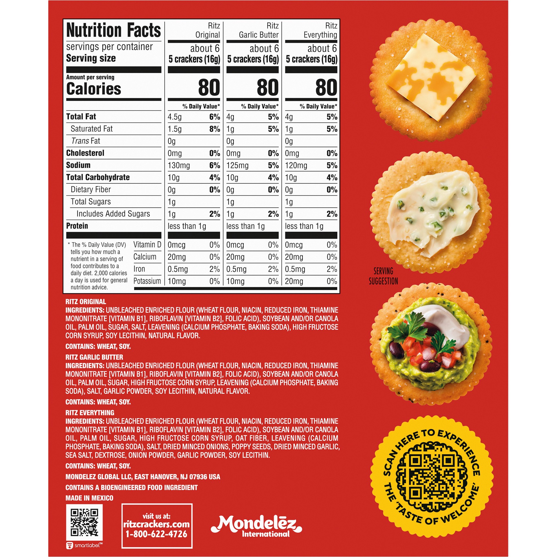Ritz Original: Unbleached Enriched Flour (Wheat Flour, Niacin, Reduced Iron, Thiamine Mononitrate [Vitamin B1], Riboflavin [Vitamin B2], Folic Acid), Soybean and/or Canola Oil, Palm Oil, Sugar, Salt, …