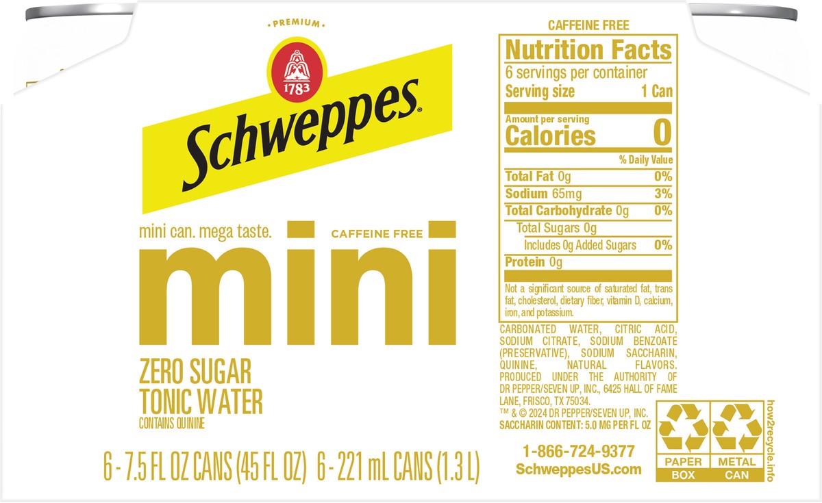 Carbonated Water, Citric Acid, Sodium Citrate, Sodium Benzoate (Preservative), Sodium Saccharin, Quinine, Natural Flavors.