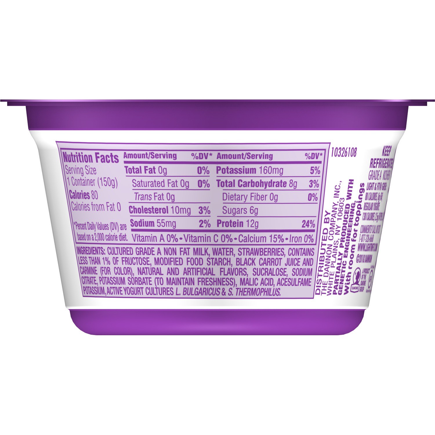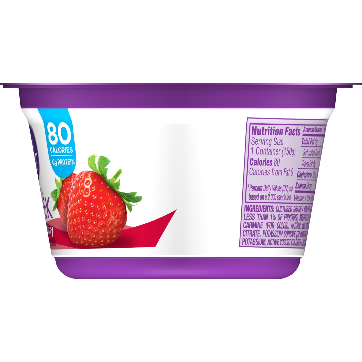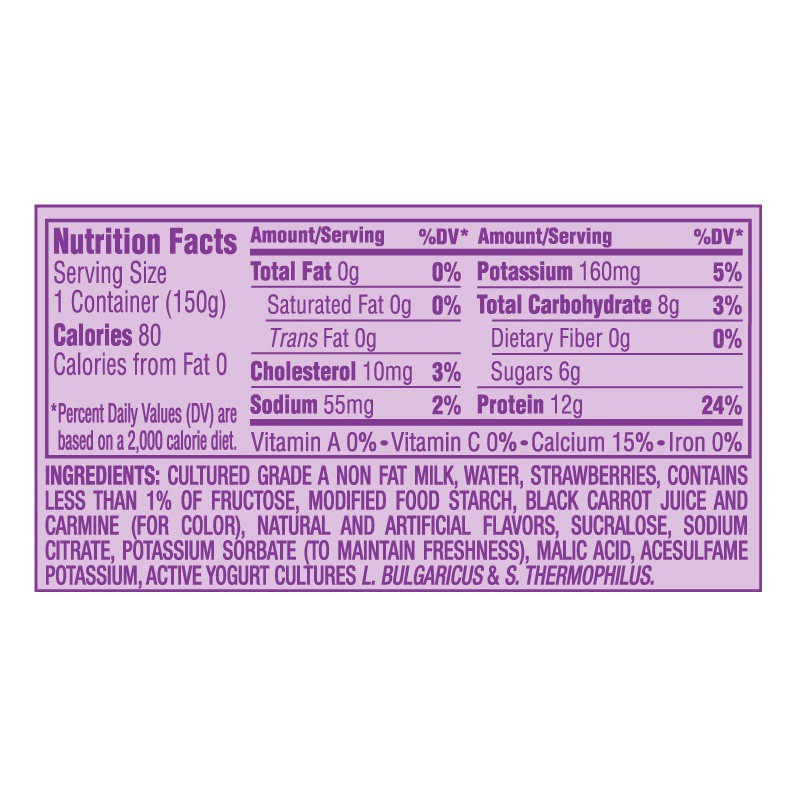 Cultured Non Fat Milk, Water, Strawberries, Less than 1%: Natural & Artificial Flavors, Black Carrot Juice & Carmine (for Color), Modified Food Starch, Acesulfame Potassium, Sucralose, Fructose, Malic…