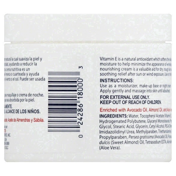 Moisturizer. Vitamin E is a natural antioxidant which softens the skin and locks in moisture to help minimize the appearance of wrinkles. Our nourishing cream is a valuable aid for dry, rough skin and…