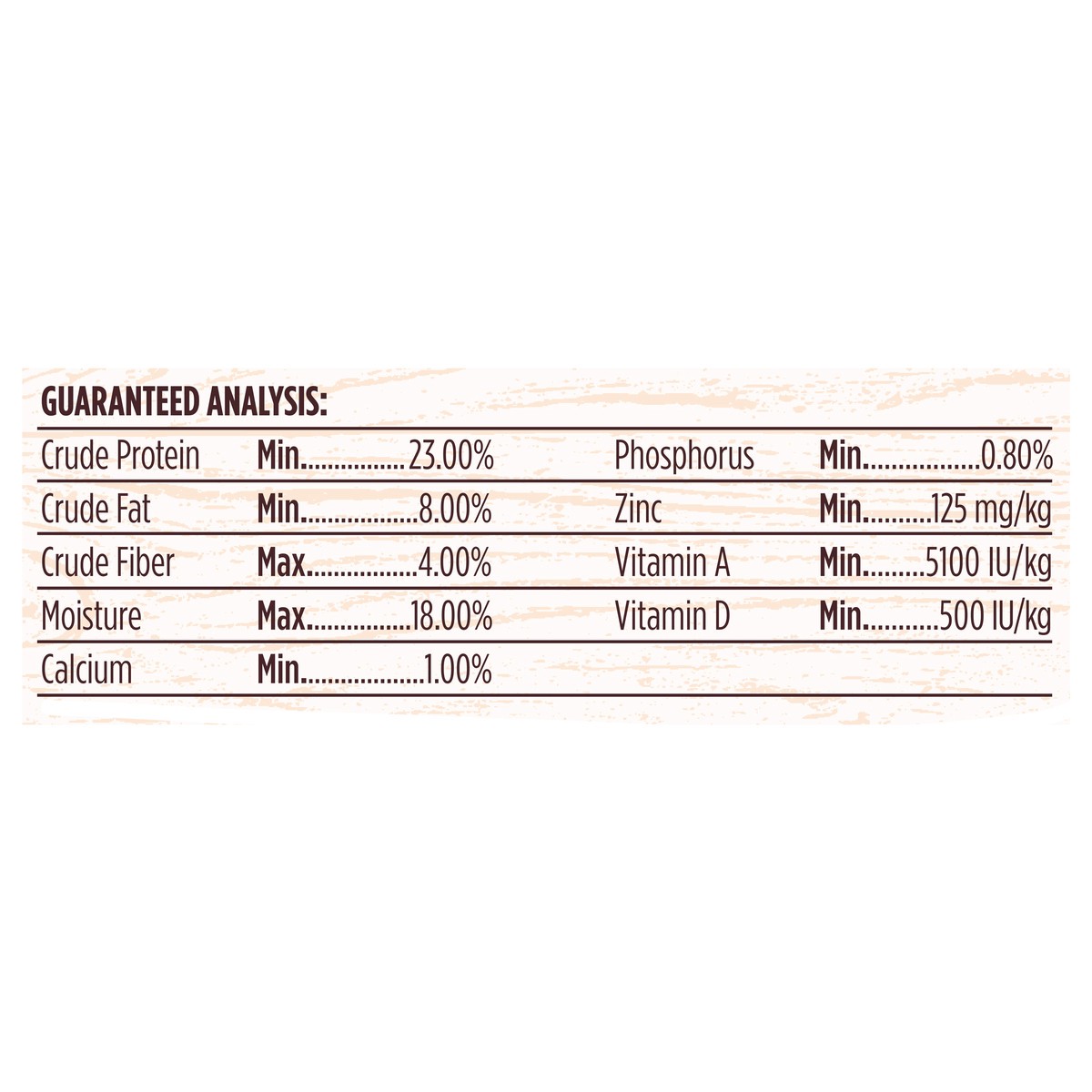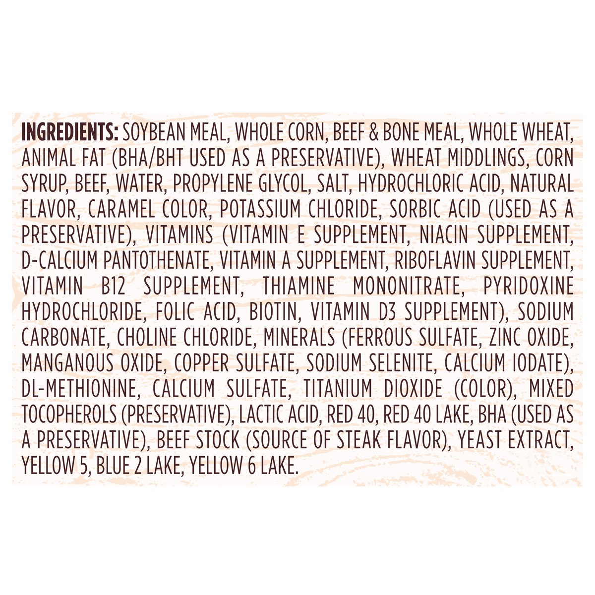 Soybean Meal, Whole Corn, Beef & Bone Meal, Whole Wheat, Animal Fat (BHA/BHT Used as a Preservative), Wheat Middlings, Corn Syrup, Beef, Water, Propylene Glycol, Salt, Hydrochloric Acid, Natural Flavo…