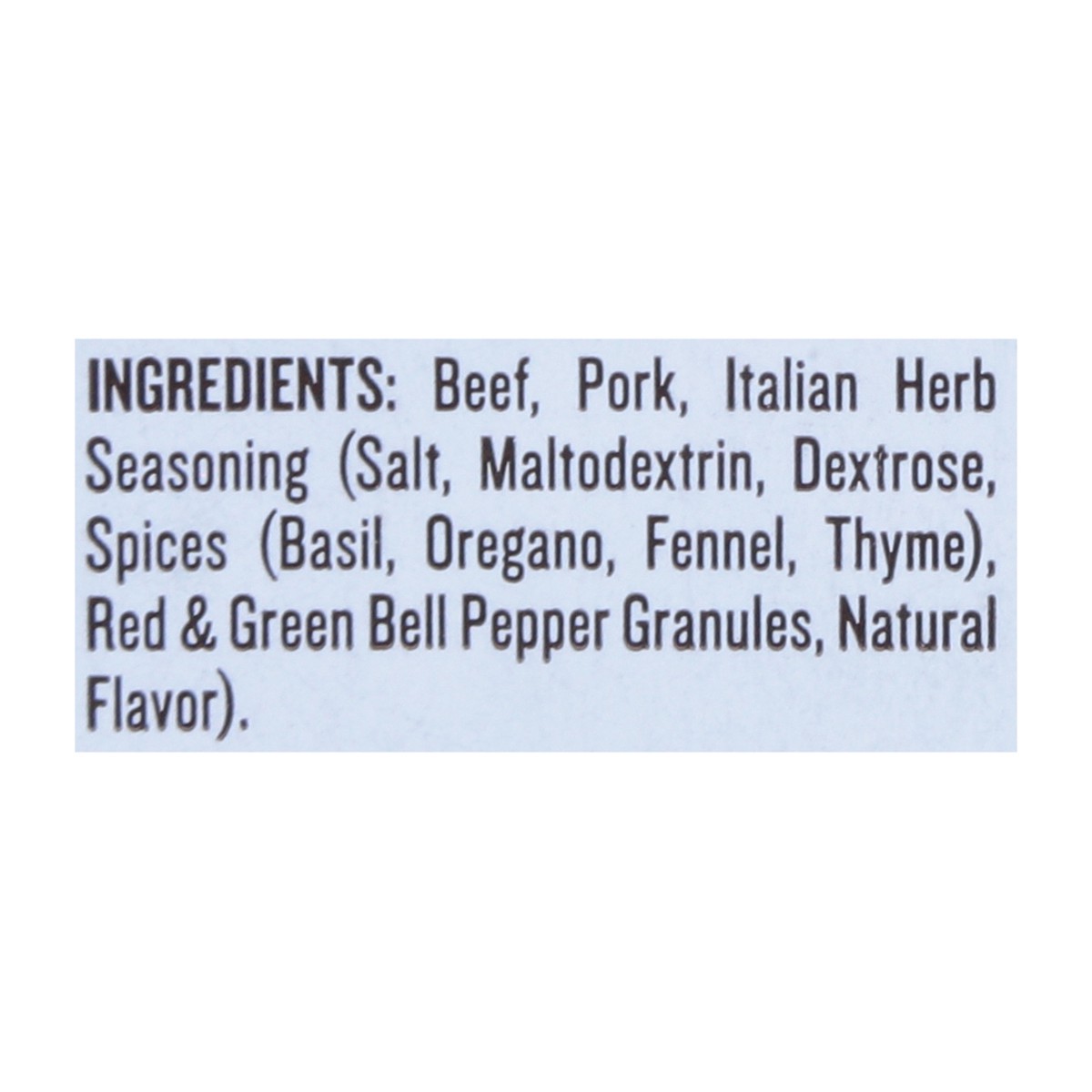 Beef, Pork, Italian Herb Seasoning (Salt, Maltodextrin, Dextrose, Spices (Basil, Oregano, Fennel, Thyme), Red and Green Bell Bepper Granules, Natural Flavor).