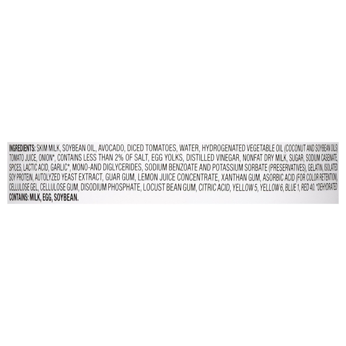 Skim Milk, Soybean Oil, Avocado, Diced Tomatoes, Water, Hydrogenated Vegetable Oil (Coconut and Soybean Oils), Tomato Juice, Onion*, Contains Less than 2% of Salt, Egg Yolks, Distilled Vinegar, Nonfat…