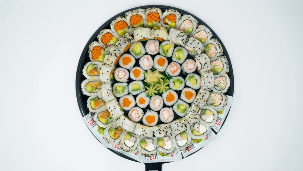 This delicious platter includes California Roll, Spicy Salmon Roll, Philadelphia Roll, Vegetarian Roll Avocado Roll, carrot roll and crab stick roll.