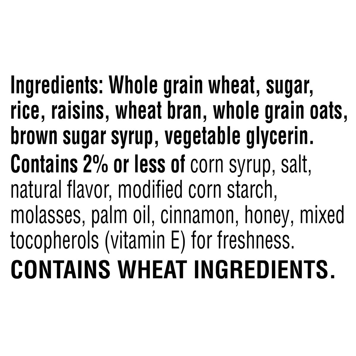 Whole Grain Wheat, Sugar, Rice, Raisins, Wheat Bran, Whole Grain Oats, Brown Sugar Syrup, Vegetable Glycerin. Contains 2% or Less of Corn Syrup, Salt, Natural Flavor, Modified Corn Starch, Molasses, P…
