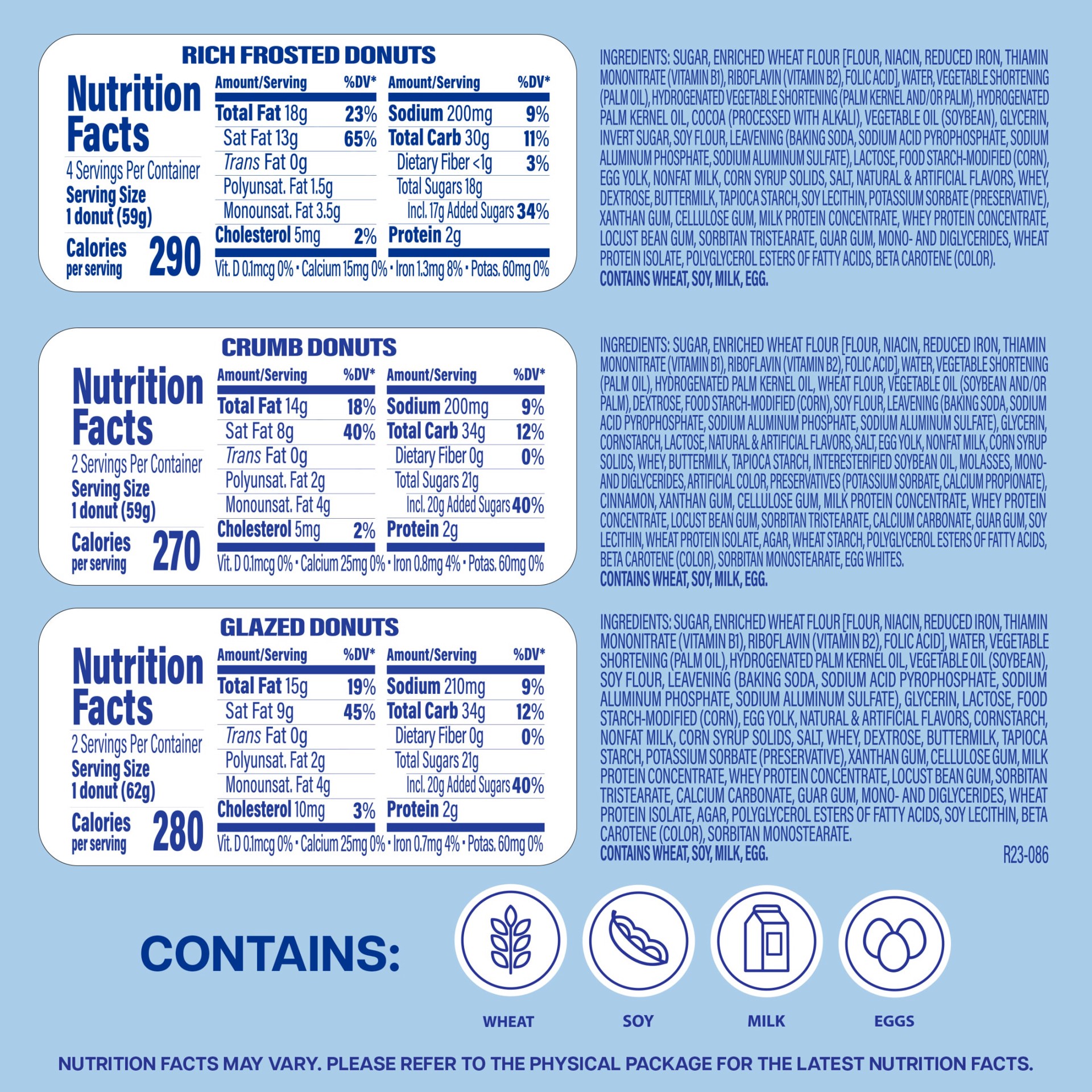 Rich Frosted Donuts Ingredients: [Sugar, Enriched Wheat Flour [Flour, Niacin, Reduced Iron, Thiamin Mononitrate (Vitamin B1), Riboflavin (Vitamin B2), Folic Acid], Water, Vegetable Shortening (Palm Oi…