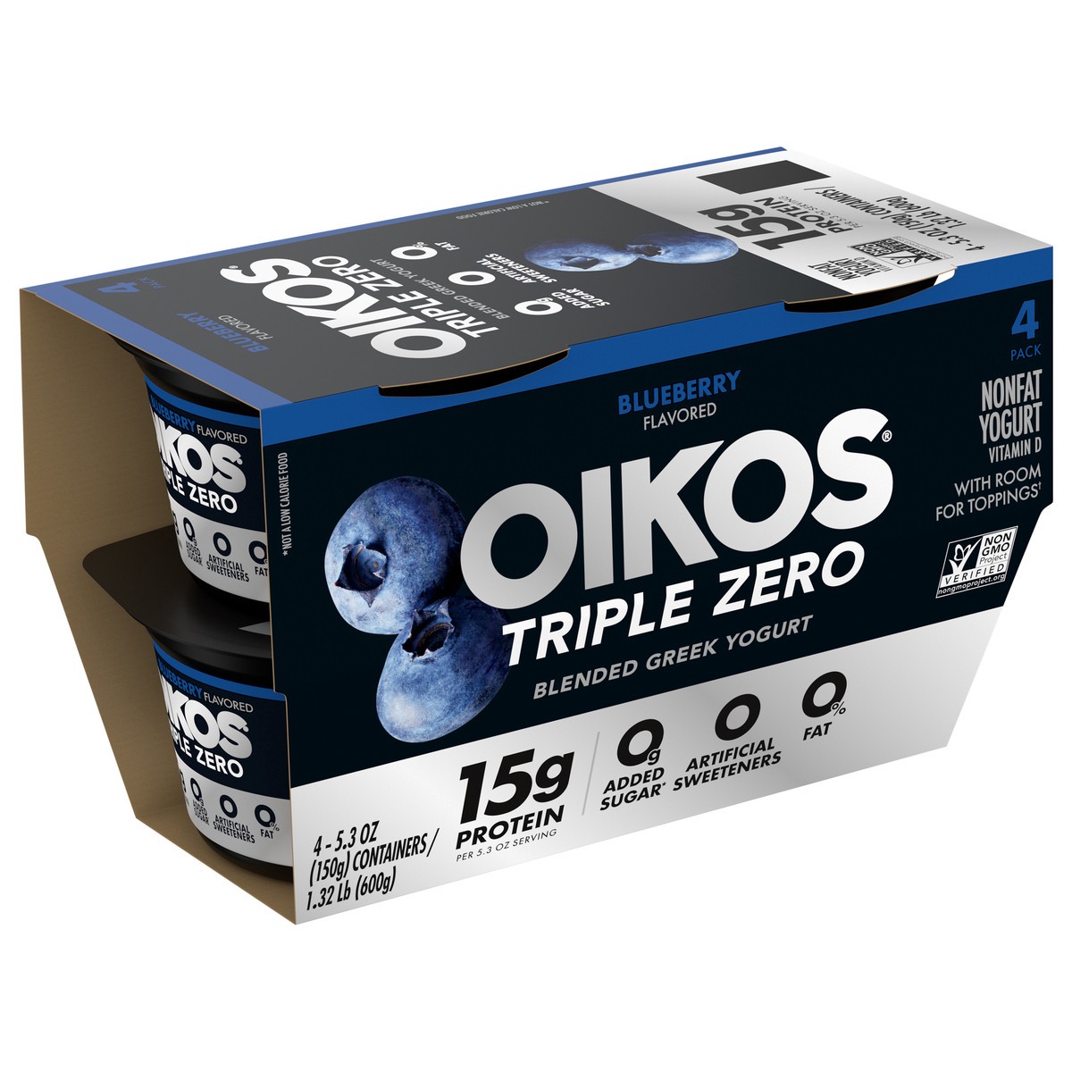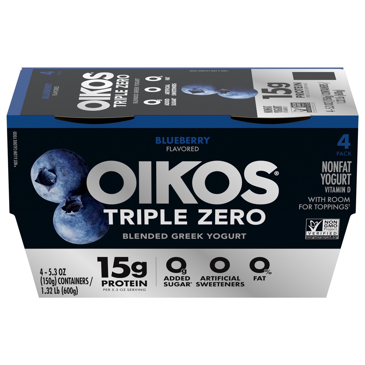 - STRONGER MAKES EVERYTHING BETTER: Four 5.3 oz yogurt cups of Oikos Triple Zero Blueberry, Nonfat Greek Yogurt