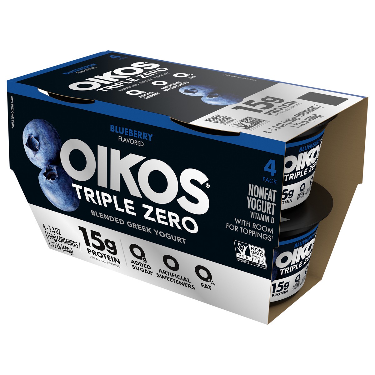 Enjoy epic tastes with Oikos Triple Zero Blueberry Nonfat Greek Yogurt Pack. With 15 grams of protein per serving, 0% fat, 0g added sugar* per 5.3 oz serving and 0 artificial sweeteners, enjoy your sn…