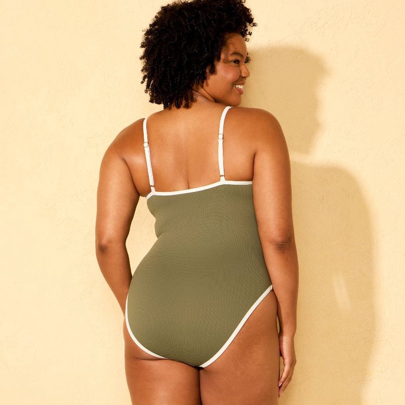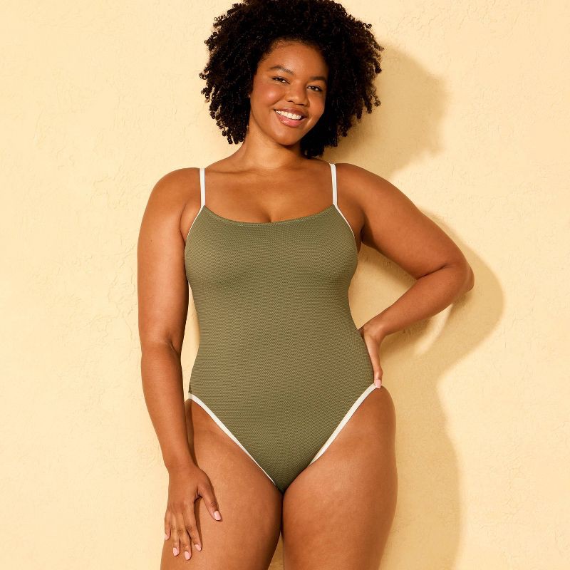 Women's Textured Contrast Binding Scoop Neck Medium Coverage One Piece Swimsuit - Shade & Shore™ Olive/Cream M