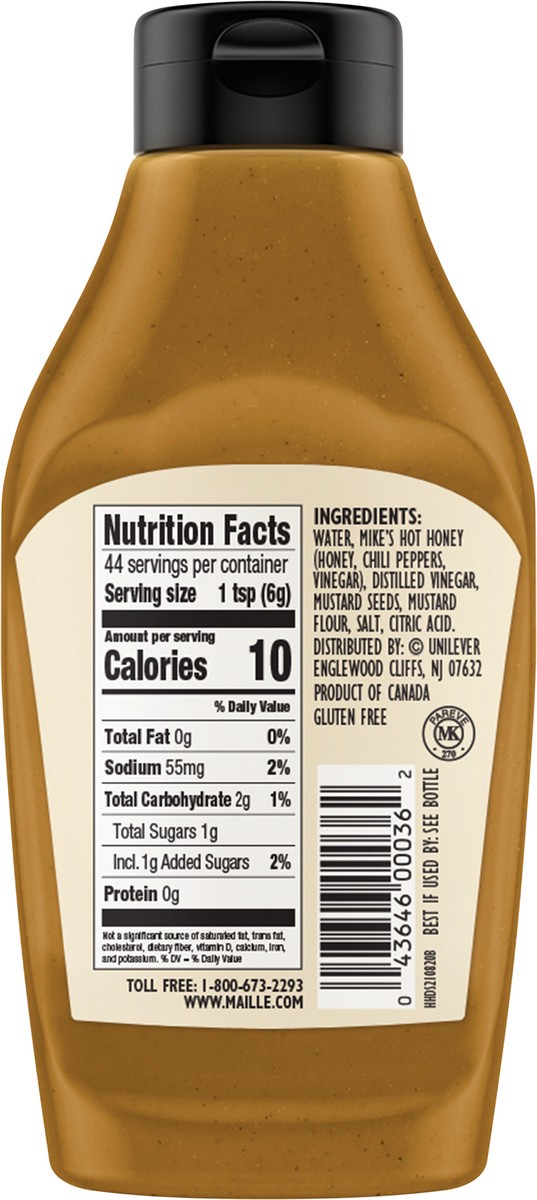 Water, Mike's Hot Honey (Honey, Chili Peppers, Vinegar), Distilled Vinegar, Mustard Seeds, Mustard Flour, Salt, Citric Acid.