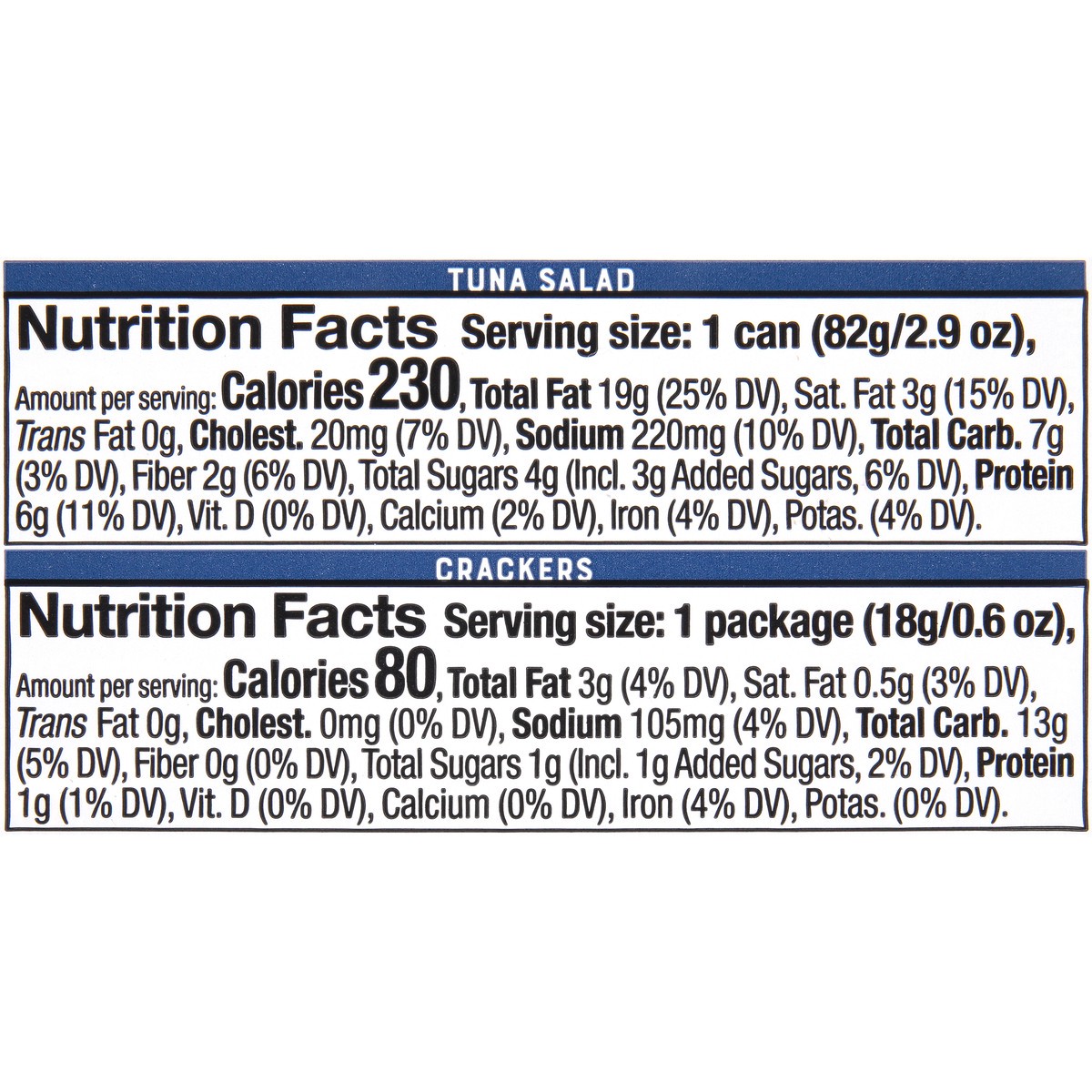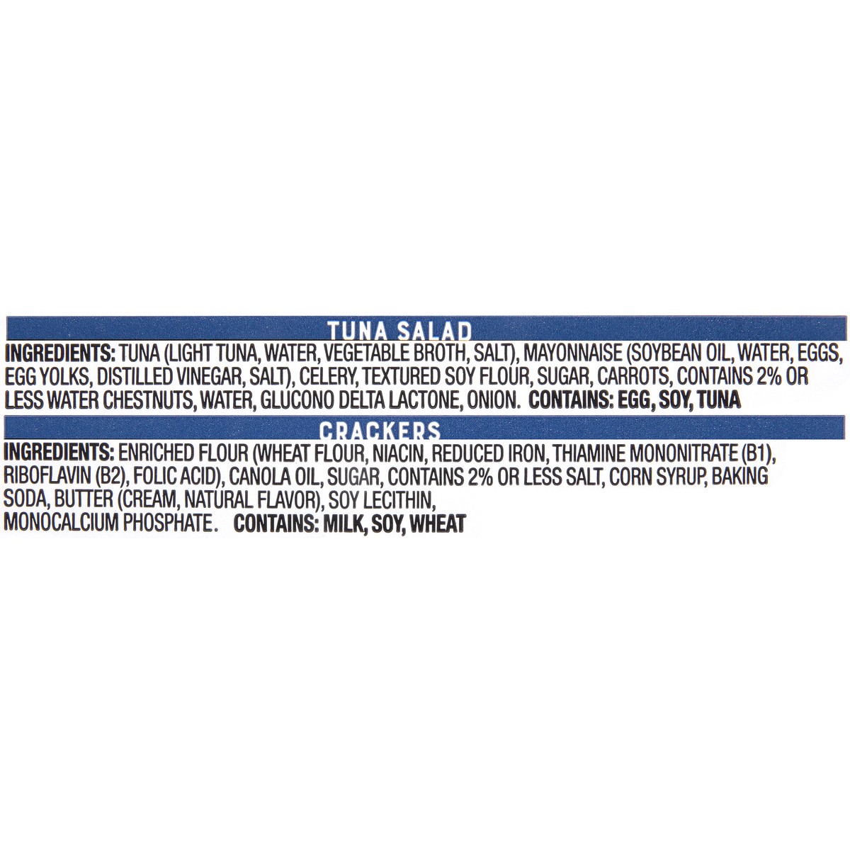 Tuna Salad: Tuna (Light Tuna, Water, Vegetable Broth, Salt), Mayonnaise (Soybean Oil, Water, Eggs, Egg Yolks, Distilled Vinegar, Salt), Celery, Textured Soy Flour, Sugar, Carrots, Contains 2% or Less …