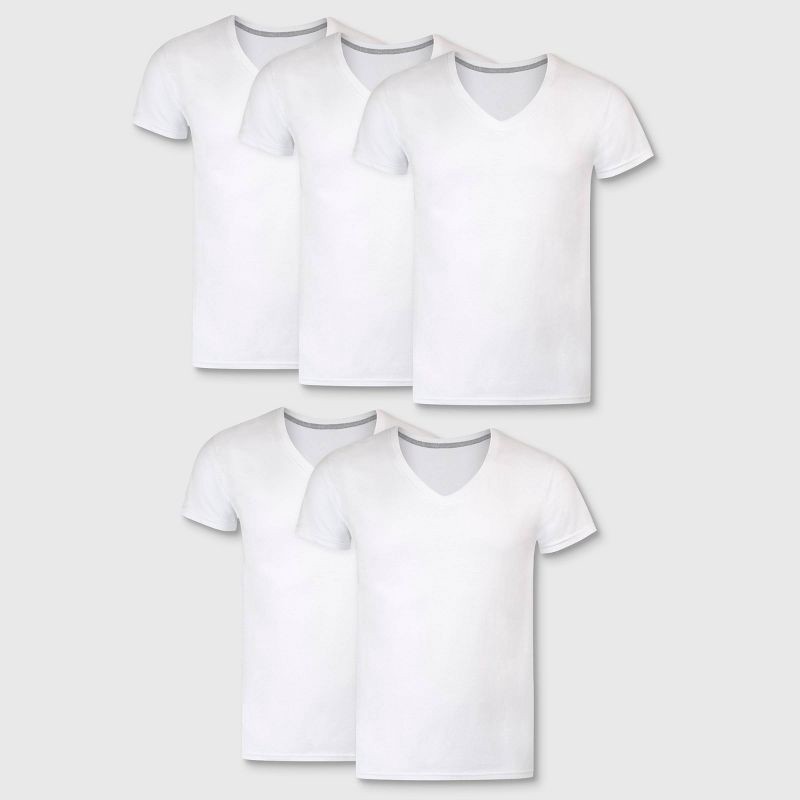 Start your day with confidence in this 5-pack of Hanes® Premium V-neck undershirts for men, built to keep your wardrobe simple, functional, and effortlessly sharp. Each men's tee features a modern, ta…