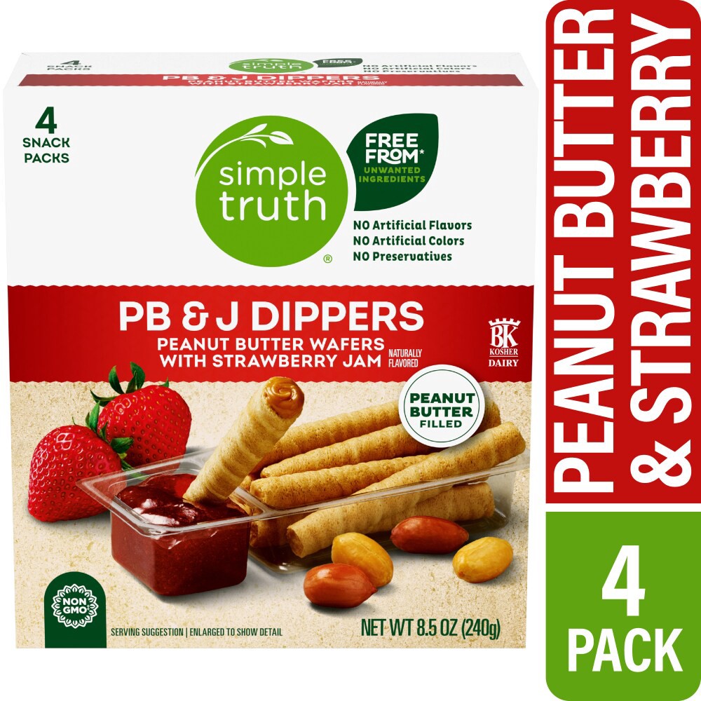Simple Truth® PB&J Strawberry Dippers make for crunchy, delicious snacking. Peanut butter filled wafer sticks are perfect for dipping in sweet strawberry jam, every pack delivers an indulgent and trus…