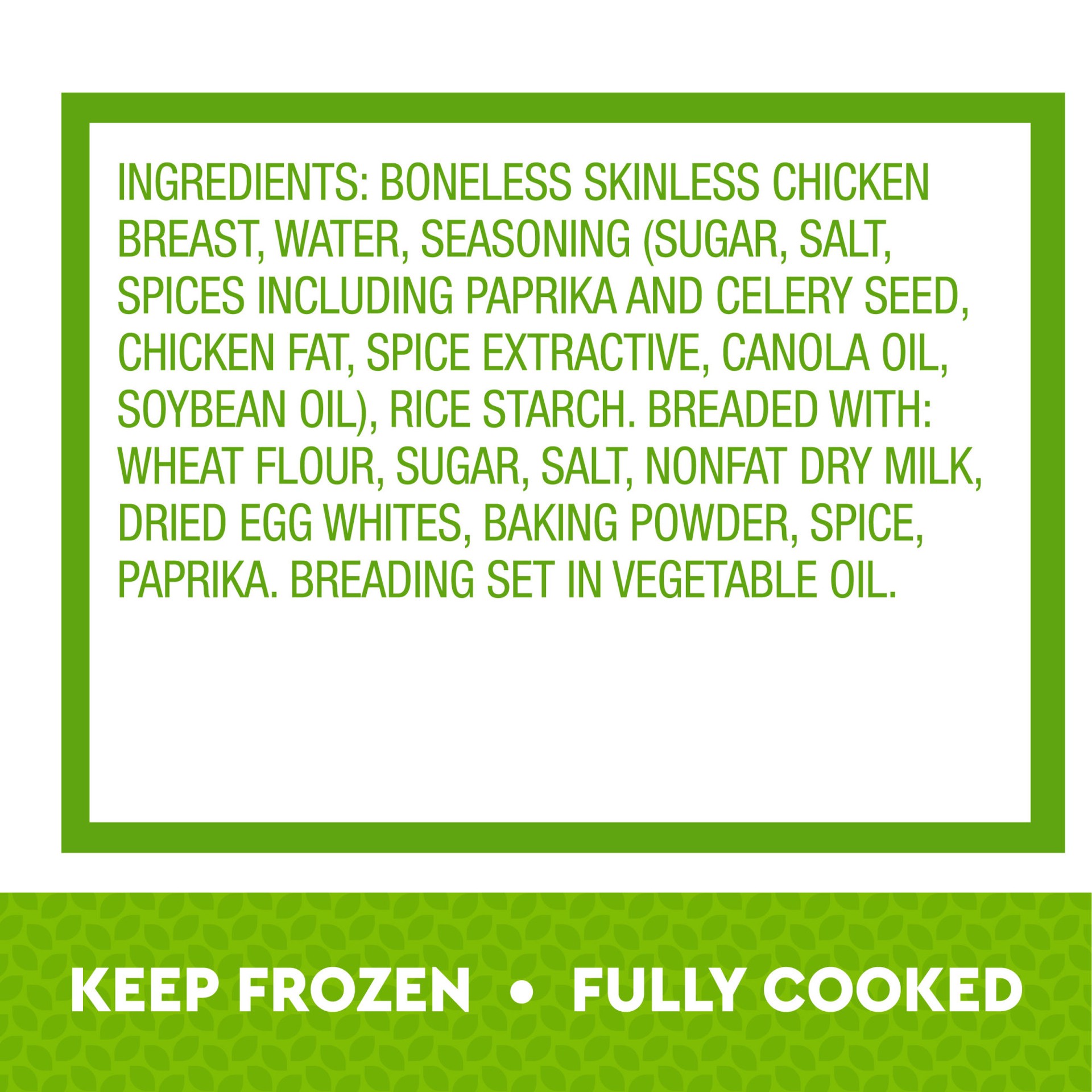 BONELESS SKINLESS CHICKEN BREAST, WATER, SEASONING (SUGAR, SALT, SPICES INCLUDING PAPRIKA AND CELERY SEED, CHICKEN FAT, SPICE EXTRACTIVE, CANOLA OIL, SOYBEAN OIL), RICE STARCH. BREADED WITH: WHEAT FLO…
