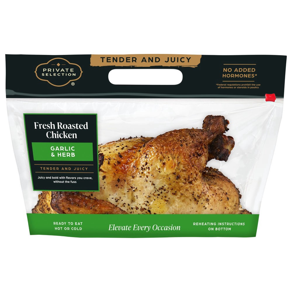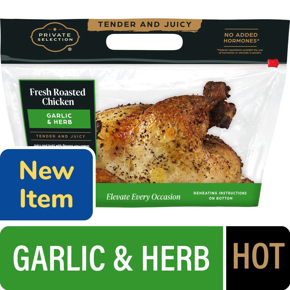 Private Selection® Garlic and Herb Whole Roasted Chicken Hot brings gourmet flair to your home dining. Succulent and tender, this juicy chicken radiates the aromatic mix of garlic and herbs. It's grea…