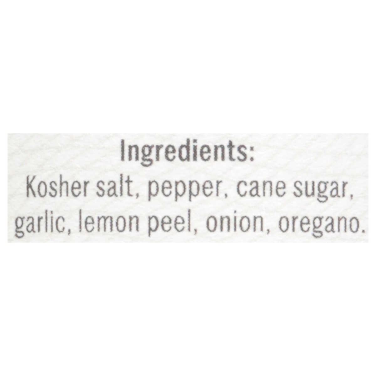 Kosher Salt, Pepper, Cane Sugar, Garlic, Lemon Peel, Onion, Oregano.
