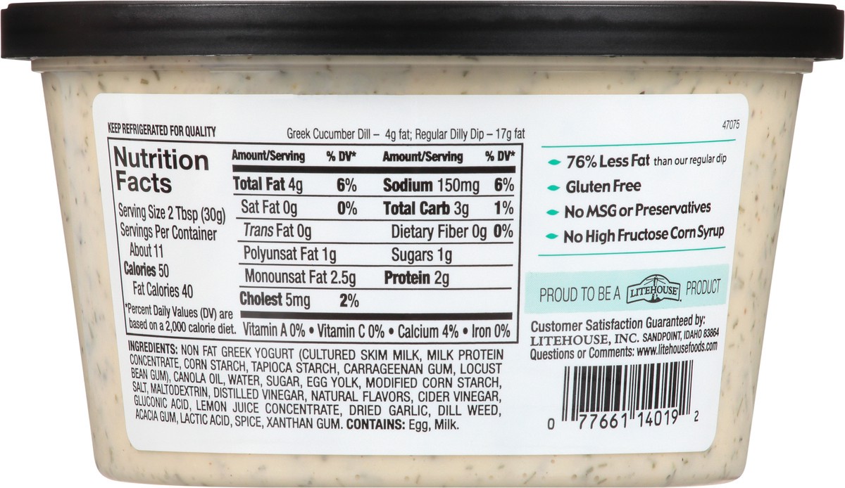 With other natural flavors. 50 calories per serving. Gluten free. Greek Cucumber Dill - 4 g fat; Regular Dilly Dip - 17 g fat. 76% Less fat than our regular dip. No MSG or preservatives. No high fruct…