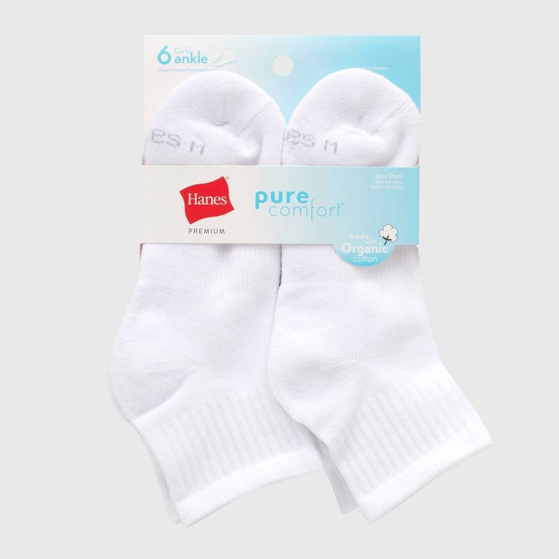 Hanes Girls' 6pk Pure Comfort Organic Cotton Ankle Socks - White S