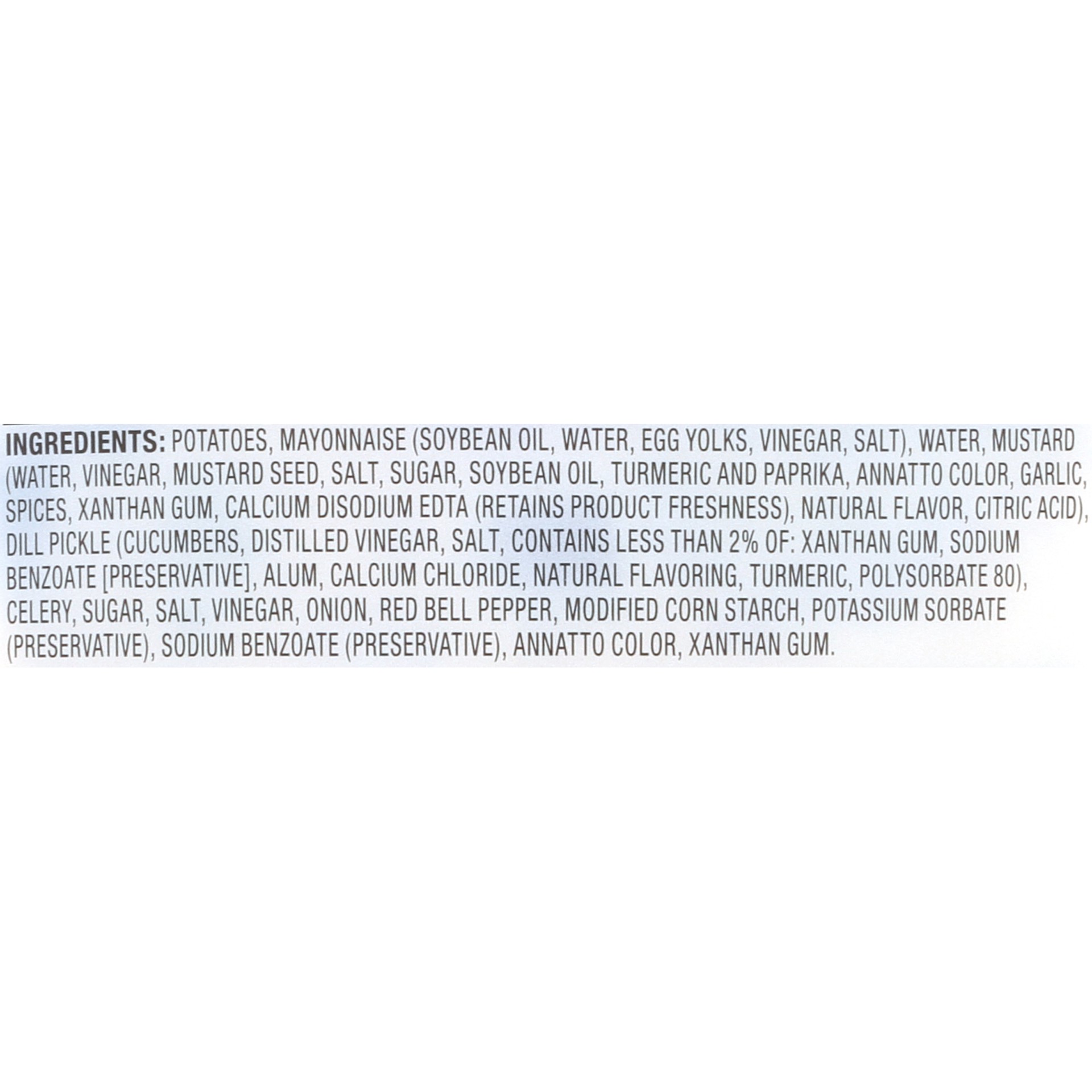 Potatoes, Mayonnaise (Soybean Oil, Water, Egg Yolks, Vinegar, Salt), Water, Mustard (Water, Vinegar, Mustard Seed, Salt, Sugar, Soybean Oil, Turmeric and Paprika, Annatto Color, Garlic, Spices, Xantha…