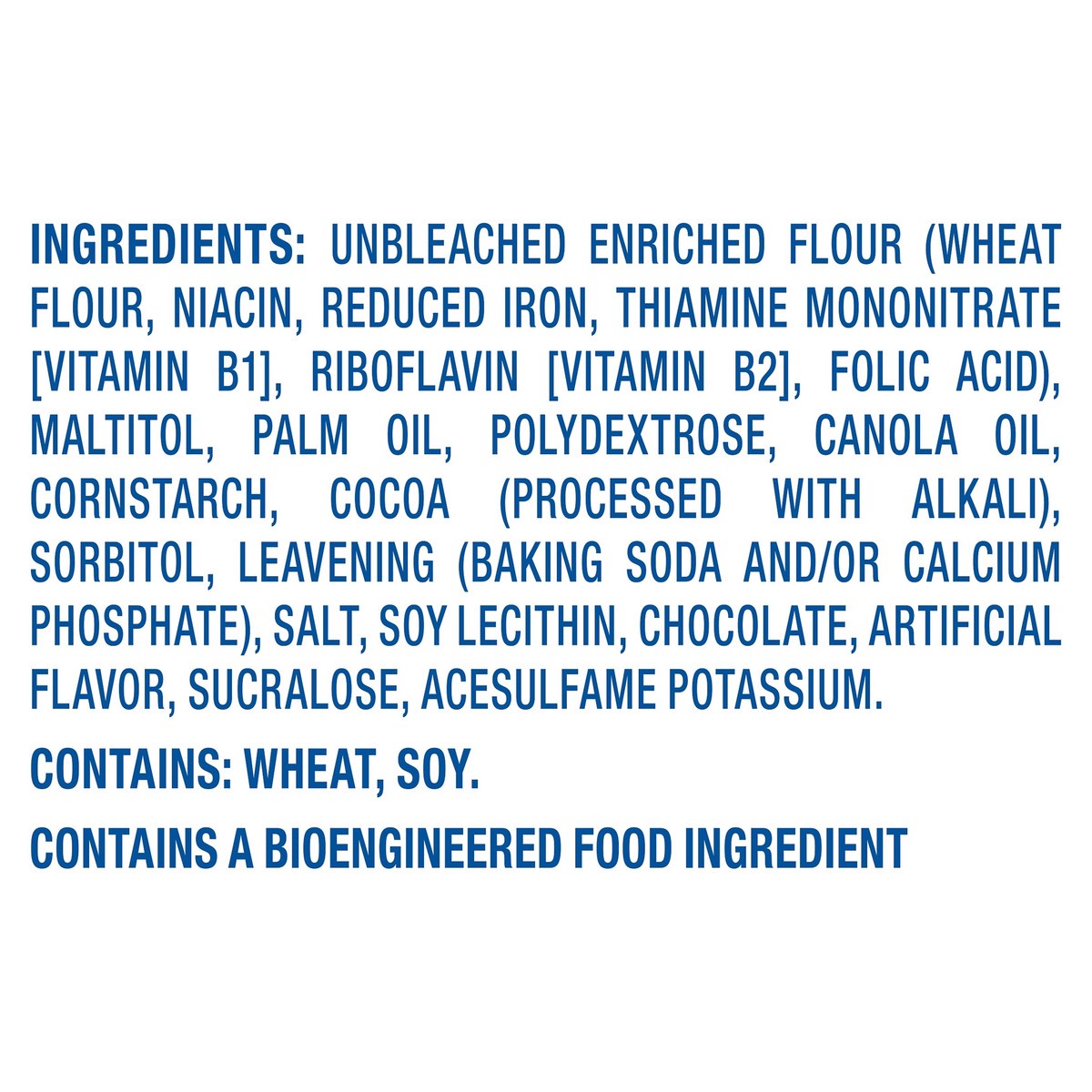 Unbleached Enriched Flour (Wheat Flour, Niacin, Reduced Iron, Thiamine Mononitrate [Vitamin B1], Riboflavin [Vitamin B2], Folic Acid), Maltitol, Palm Oil, Polydextrose, Canola Oil, Cornstarch, Cocoa (…