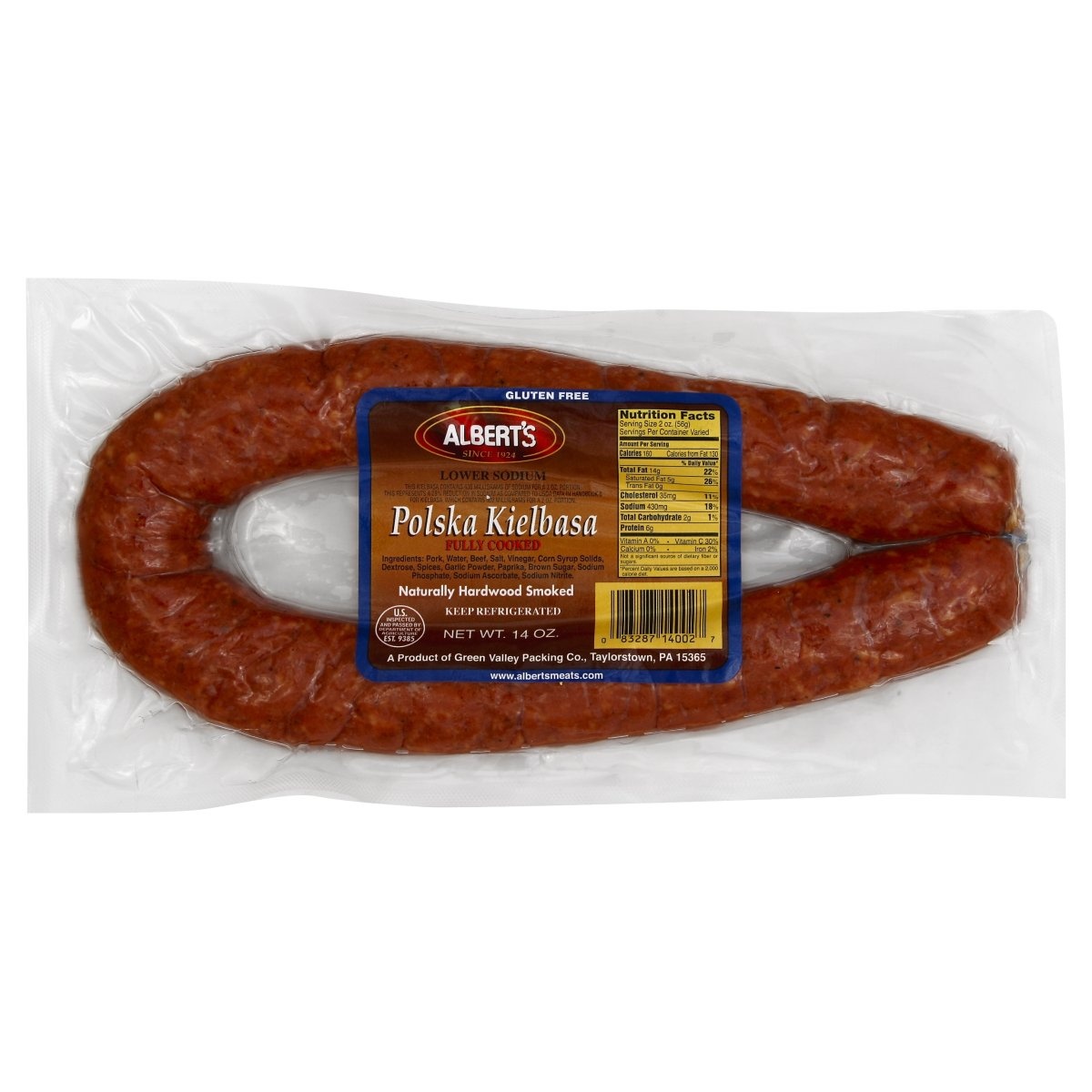 Naturally hardwood smoked. Gluten free. Since 1924. This kielbasa contains 430 milligrams of sodium for a 2 oz portion. This represents a 28% reduction in sodium as compared to USDA data in handbook 8…