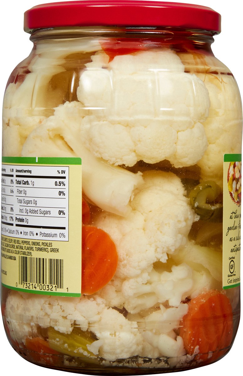 Vegetable Mix (Cauliflower, Carrots, Celery, Red Bell Peppers, Onions, Pickles [Cucumbers, Water, Distilled Vinegar, Salt, Calcium Chloride, Natural Flavors, Turmeric], Greek Peppers), Water, Sea Salt…