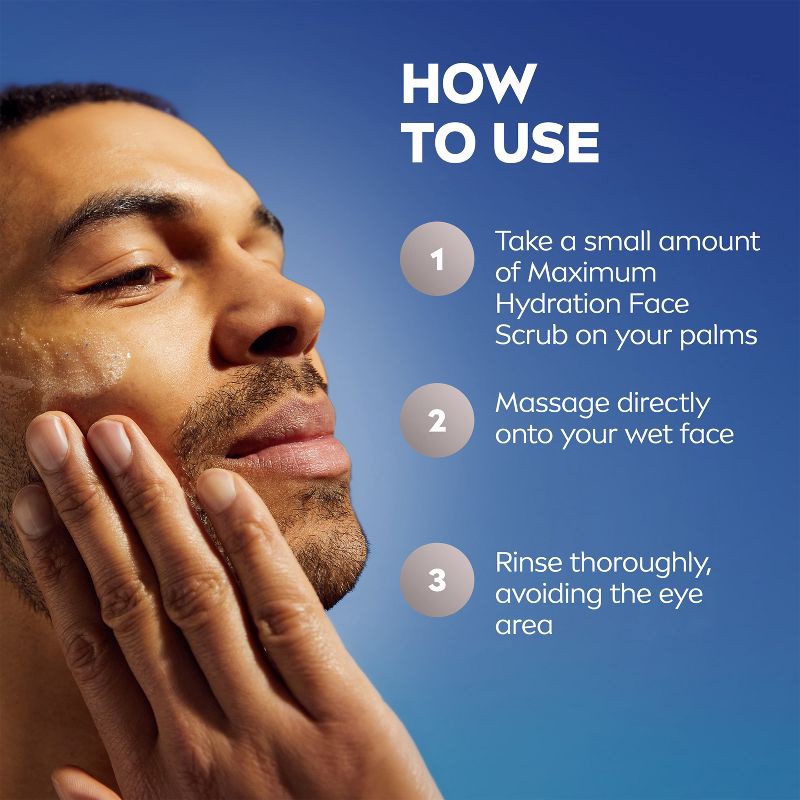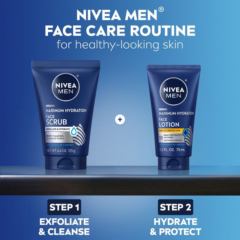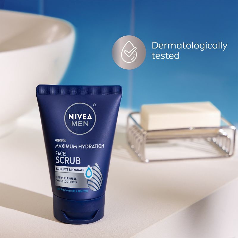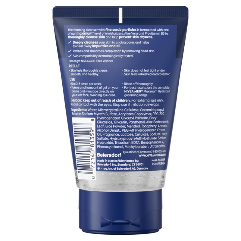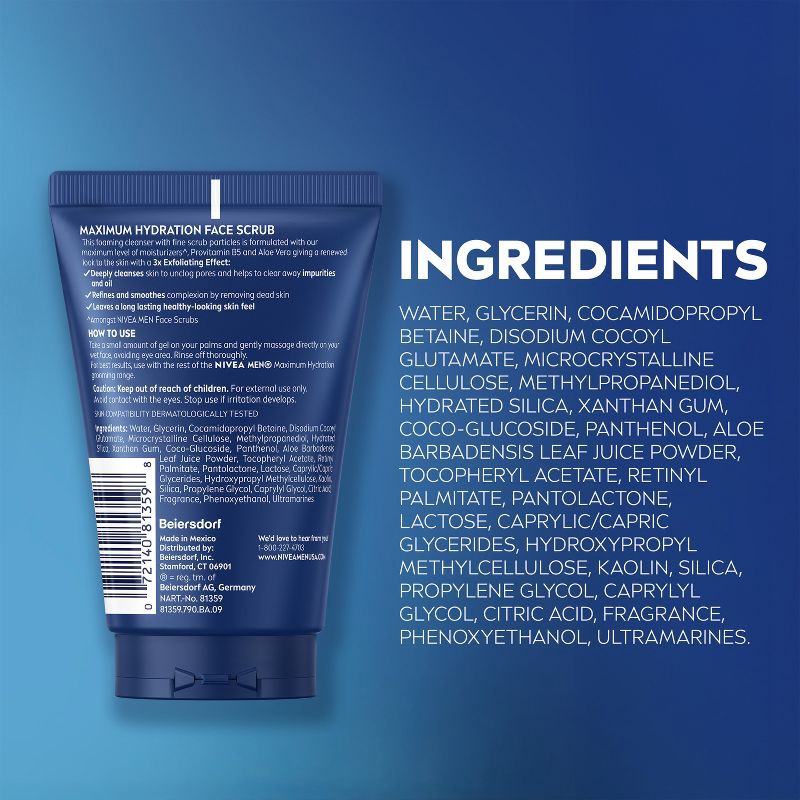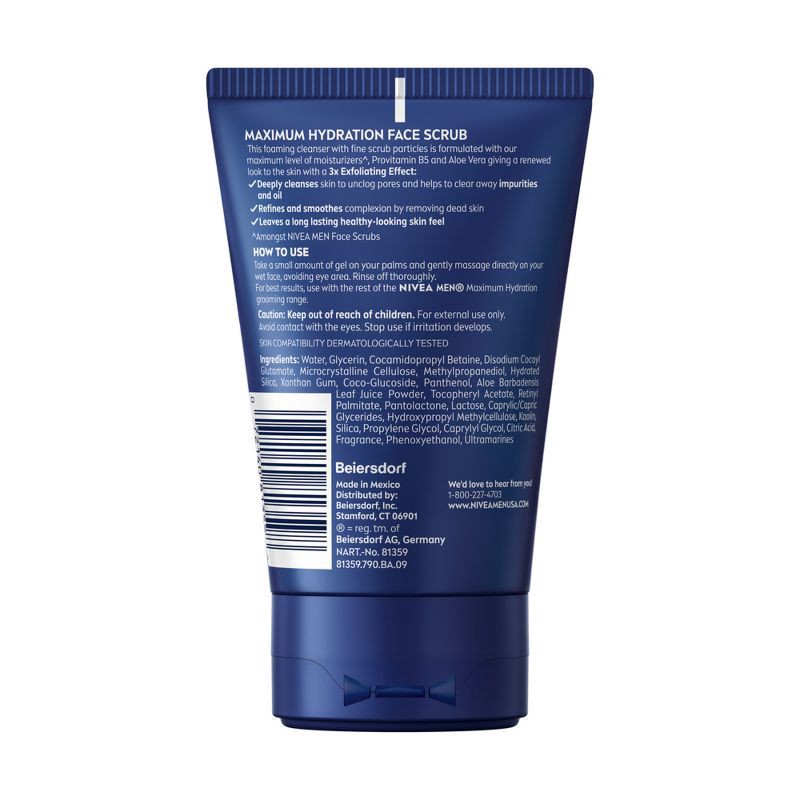- One 4.4 ounce tube of NIVEA MEN Maximum Hydration Face Scrub with Provitamin B5 and Aloe Vera