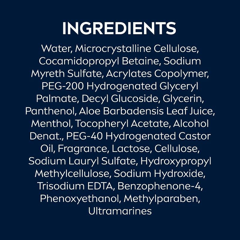 Water, Microcrystalline Cellulose, Cocamidopropyl Betaine, Sodium Myreth Sulfate, Acrylates Copolymer, PEG-200 Hydrogenated Glyceryl Palmate, Decyl Glucoside, Glycerin, Panthenol, Aloe Barbadensis Lea…