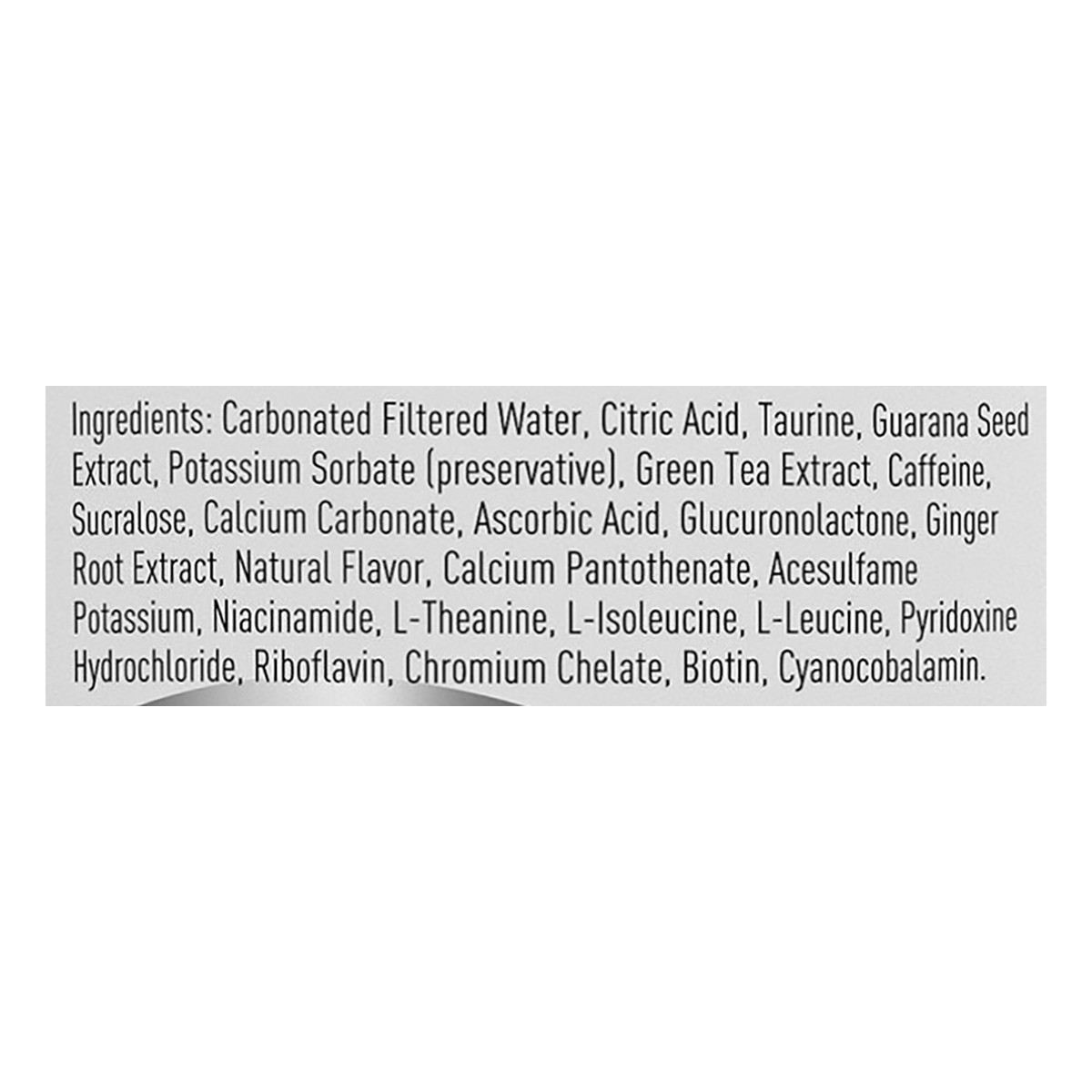 Carbonated Filtered Water, Citric Acid, Taurine, Guarana Seed Extract, Potassium Sorbate (Preservative), Green Tea Extract, Caffeine, Sucralose, Calcium Carbonate, Ascorbic Acid, Glucuronolactone, Gin…