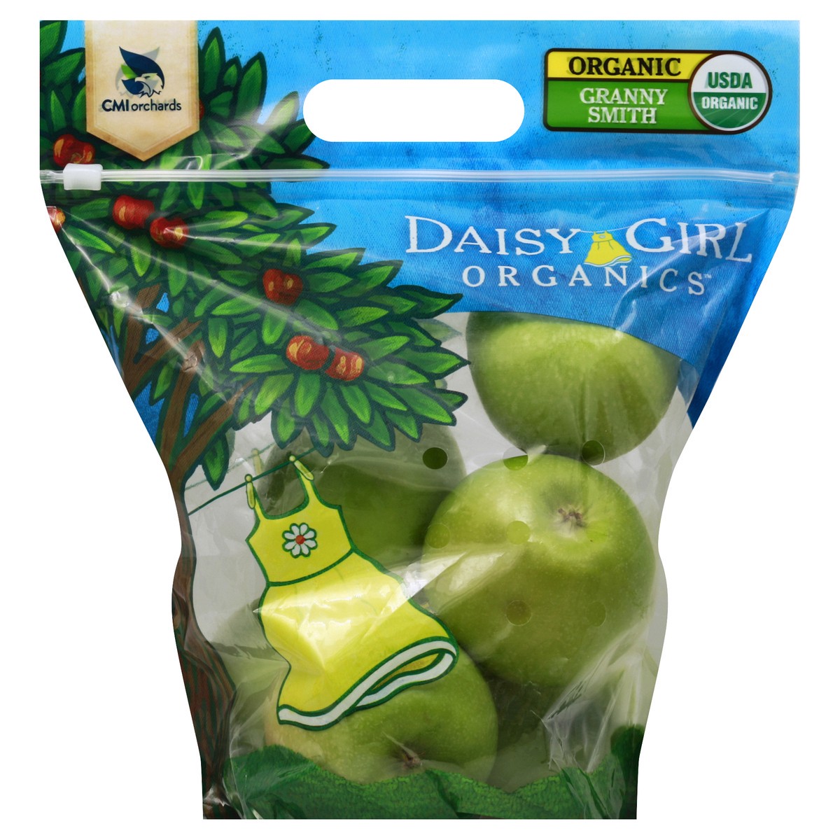 2-3/8 in min dia. USDA Organic. Certified Organic by Washington State Department of Agriculture. US extra fancy. daisygirlorganics.com. cmiorchards.com. Facebook/DaisyGirlOrganics. Product of USA.