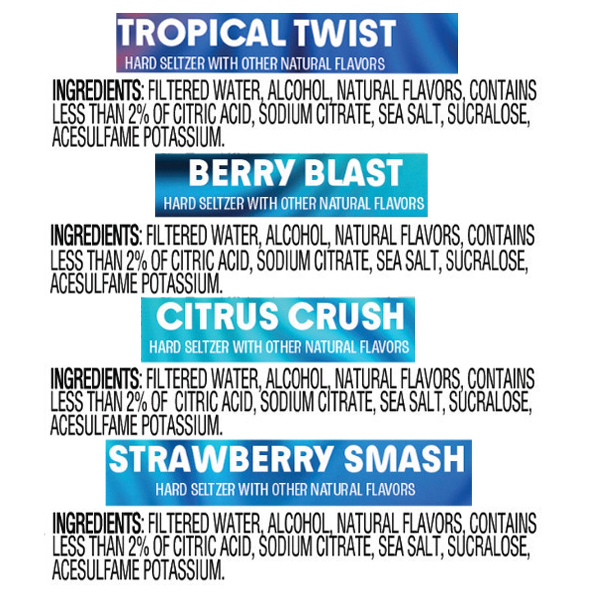 Tropical Twist: Filtered Water, Alcohol Natural Flavors, Contains Less than 2% or Orange Juice from Concentrate, Pineapple Juice from Concentrate, Citric Acid, Sodium Citrate, Sea Salt, Sucralose, Ace…