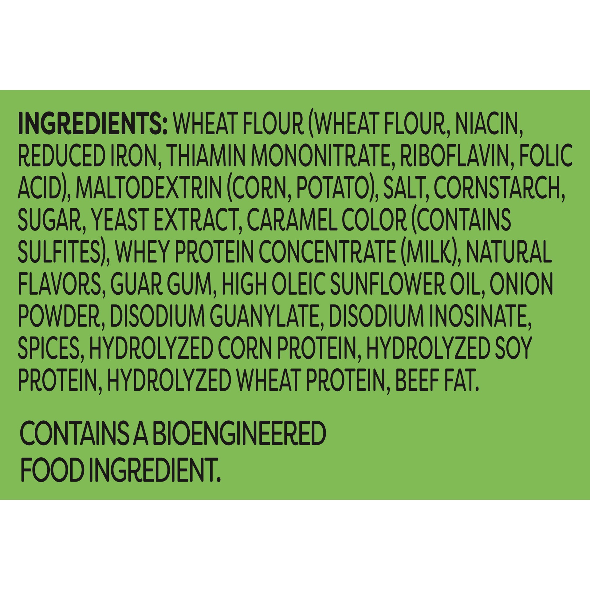 Wheat Flour (Wheat Flour, Niacin, Reduced Iron, Thiamin Mononitrate, Riboflavin, Folic Acid), Maltodextrin (Corn, Potato), Salt, Cornstarch, Sugar, Yeast Extract, Caramel Color (Contains Sulfites), Wh…