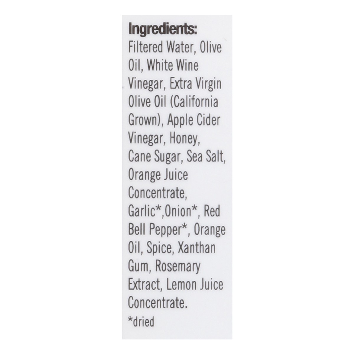 Filtered Water, Olive Oil, White Wine Vinegar, Extra Virgin Olive Oil (California Grown), Apple Cider Vinegar, Honey, Cane Sugar, Sea Salt, Orange Juice Concentrate, Garlic (Dried),Onion (Dried), Red …