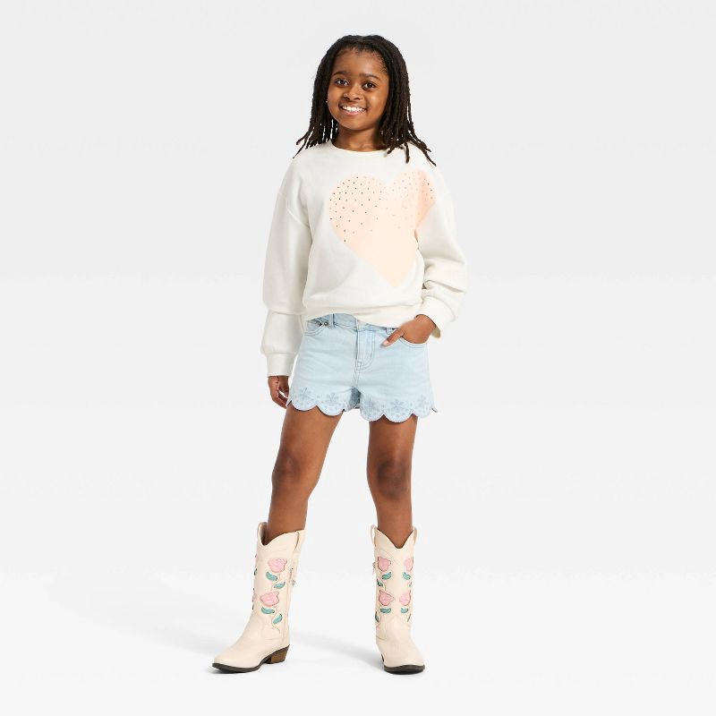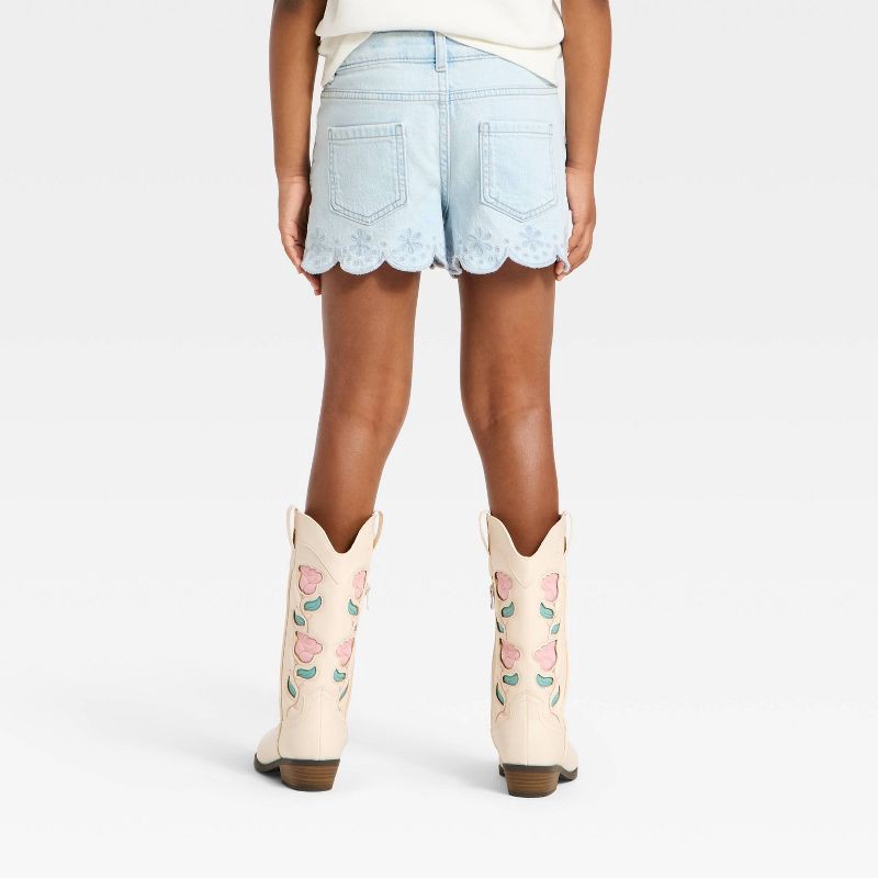 Bring cool style to your kid's everyday wardrobe with these Mid-Rise Scallop-Hem Embroidered Jean Shorts from Cat & Jack™. These mid-rise denim shorts are made from cotton-spandex blend fabric for a c…