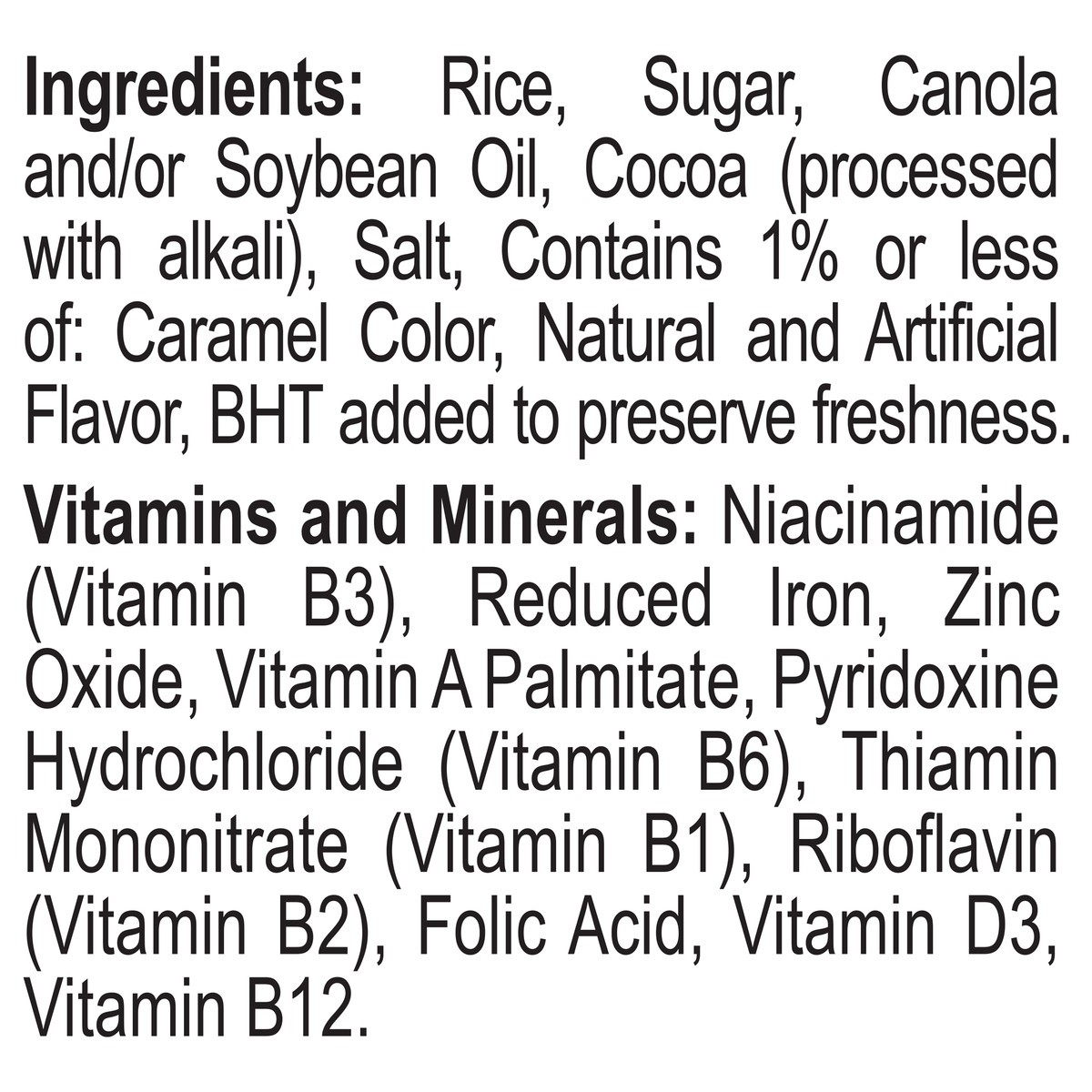 Rice, Sugar, Canola and/or Soybean Oil, Cocoa (Processed with Alkali), Salt, Contains 1% or Less of: Caramel Color, Natural and Artificial Flavor, BHT Added to Preserve Freshness. Vitamins and Mineral…
