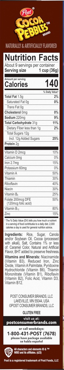Post Cocoa Pebbles Gluten Free Cocoa Flavored Crispy Rice Cereal - 11 Oz
