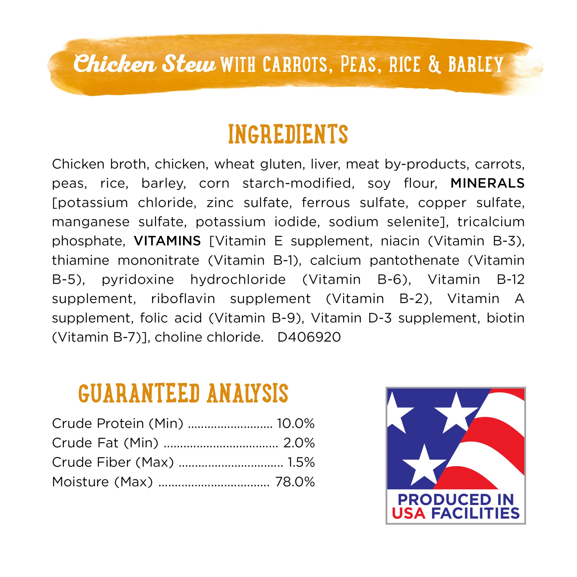Savory Rice & Lamb Stew: Water, Wheat Gluten, Liver, Meat By-Products, White Rice, Lamb, Peas, Carrots, Chicken, Wild Rice, Corn Starch-Modified, Tricalcium Phosphate, Soy Flour, Minerals [Potassi…