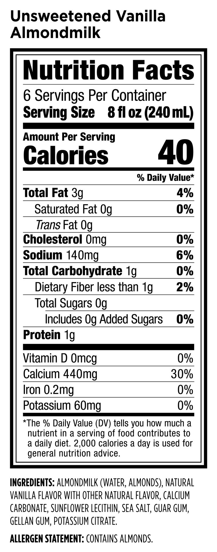 Almondmilk (Water, Almonds), Natural Vanilla Flavor with Other Natural Flavor, Calcium Carbonate, Sunflower Lecithin, Sea Salt, Locust Bean Gum, Gellan Gum, Potassium Citrate