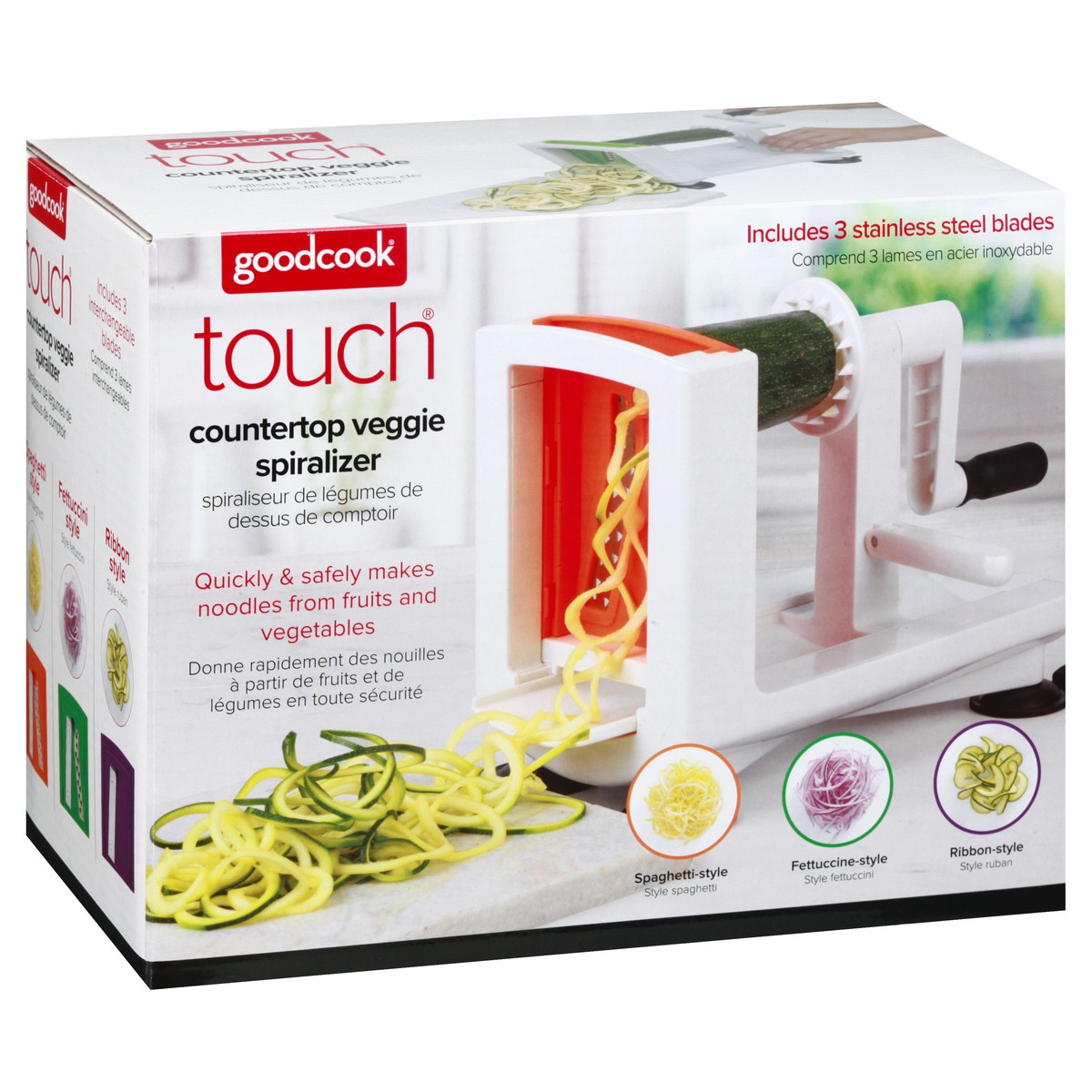 Quickly & safely makes noodles from fruits and vegetables. Includes 3 stainless steel blades. Spaghetti-style. Fettuccine-style. Ribbon-style. (1) 3 Color coded blades for spaghetti, Fettuccini, or ri…