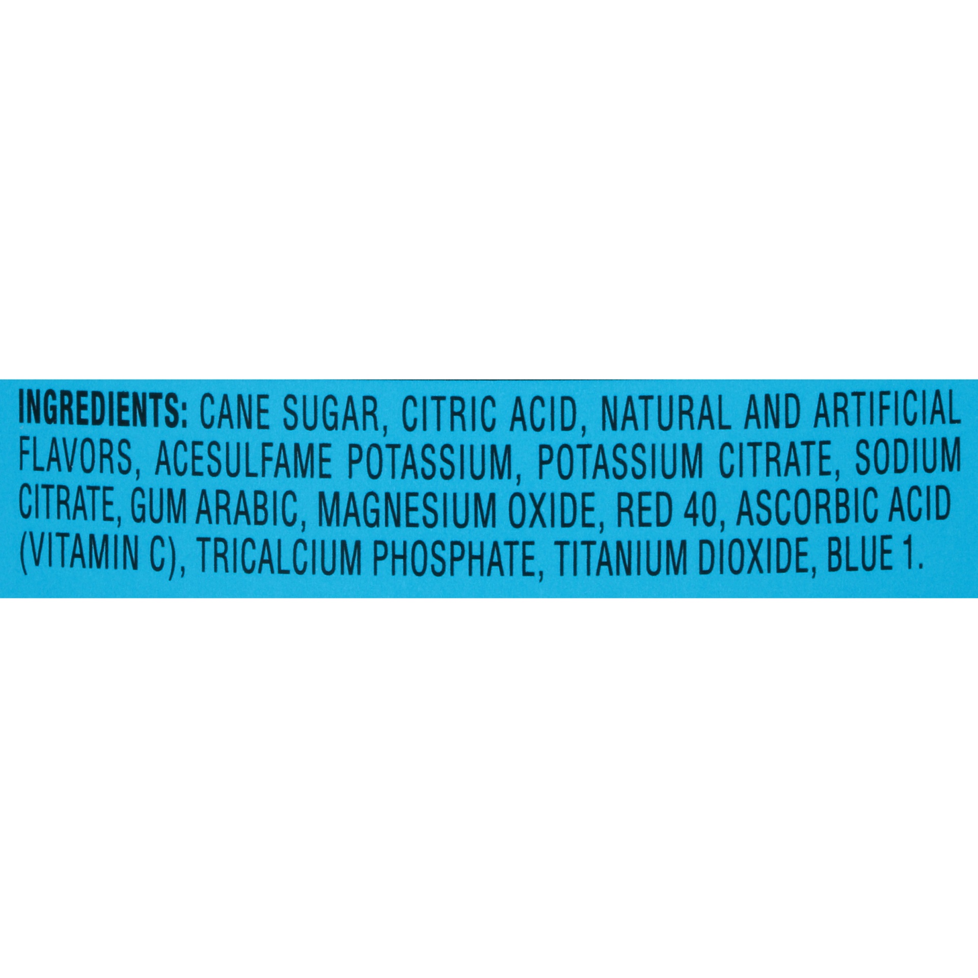Cane Sugar, Citric Acid, Natural and Artificial Flavors, Acesulfame Potassium, Potassium Citrate, Sodium Citrate, Gum Arabic, Magnesium Oxide, Red 40, Ascorbic Acid (Vitamin C), Tricalcium Phosphate, …