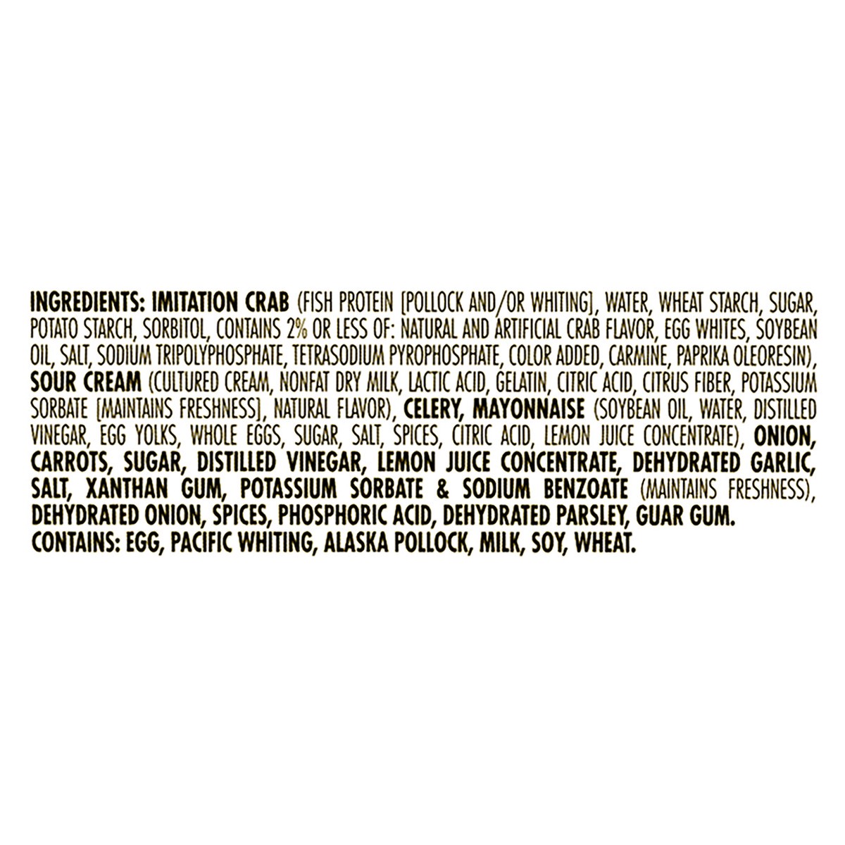 Imitation Crab (Fish Protein [Pollock and/or Whiting], Water, Wheat Starch, Sugar, Potato Starch, Sorbitol, Contains 2% or Less of: Natural and Artificial Crab Flavor, Egg Whites, Soybean Oil, Salt, S…