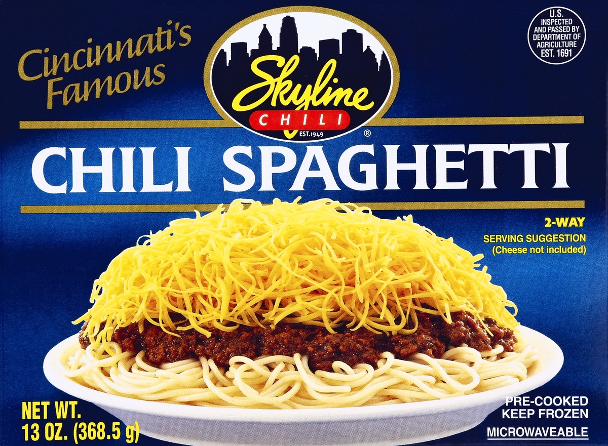 Cincinnati's famous. Est. 1949. US inspected and passed by Department of Agriculture. 2-way. Cheese not included. Microwaveable. Mail Order: 1-888-752-4454. Questions: 1-800-443-4371. www.SkylineChili…