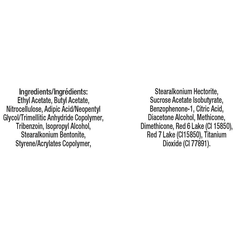Ethyl Acetate, Butyl Acetate, Nitrocellulose, Propyl Acetate, Tosylamide/Formaldehyde Resin, Isopropyl Alcohol, Trimethyl Pentanyl Diisobutyrate, Triphenyl Phosphate, Ethyl Tosylamide, Camphor, Steara…