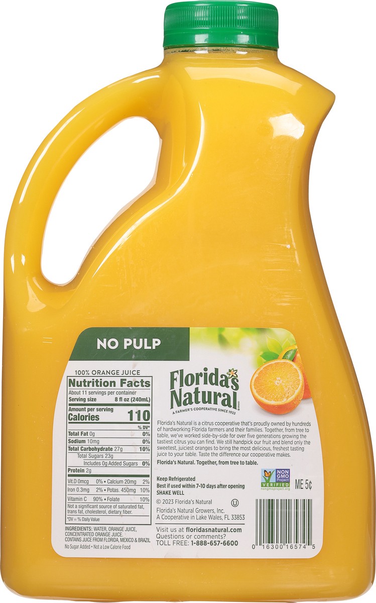 100% premium Florida orange juice. Pasteurized. Not from concentrate/non GMO. Farmer owned in the USA. 100% orange juice. We're the only major orange juice brand that's owned by farmers and you can ta…